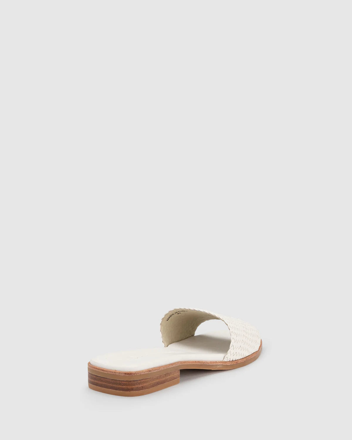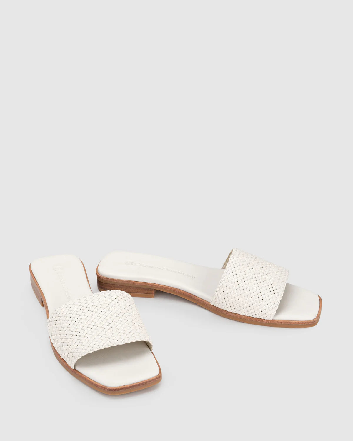 The SOLACE SLIDE in Milk is an elegant recycled leather slide featuring a handwoven strap detail for subtle texture. Its soft neutral tone and slim profile make it ideal for refined, everyday dressing — from wide-leg pants to floaty skirts.