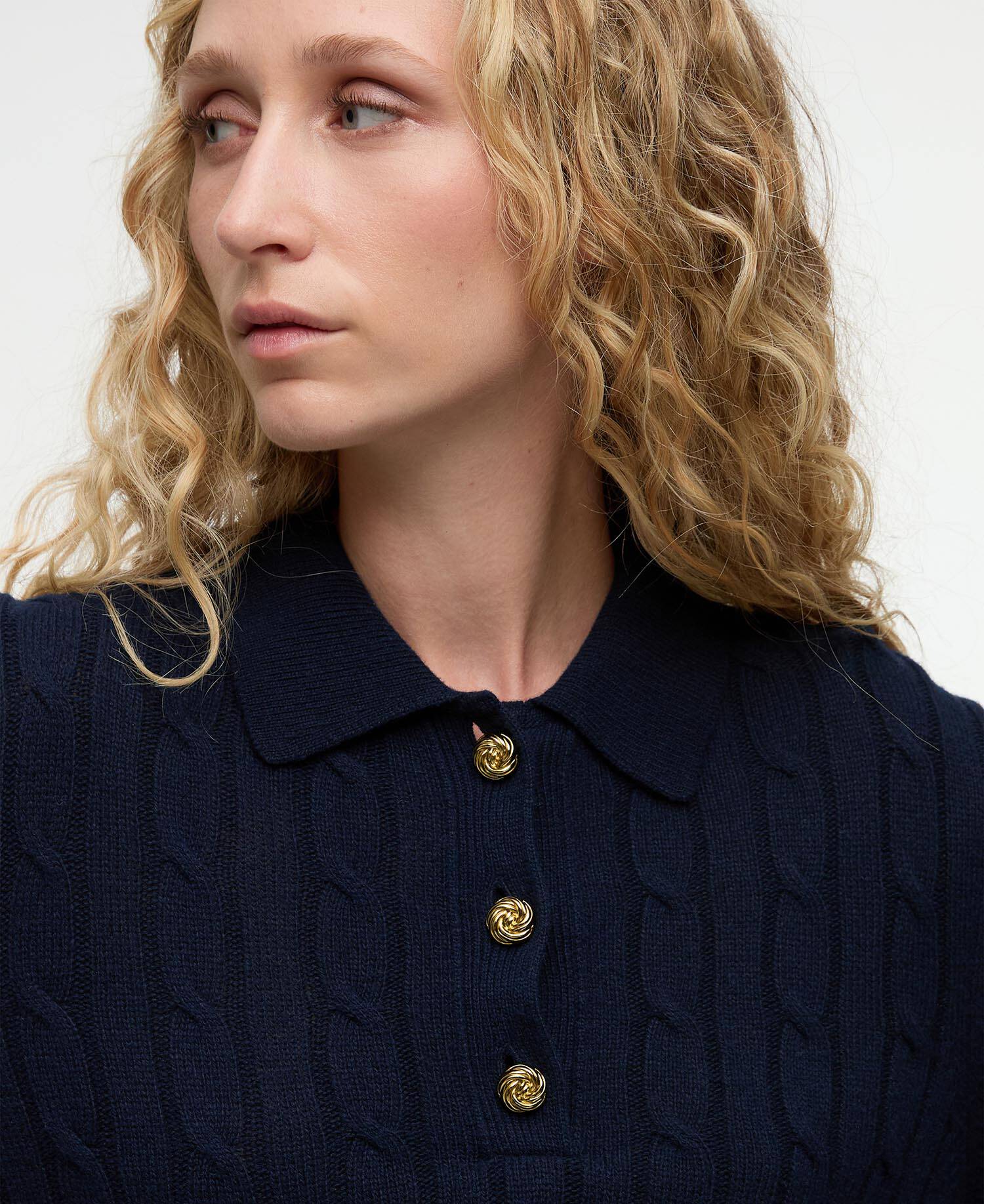 The Barbour Evie Collared Jumper combines timeless charm with modern comfort. Crafted in a wool blend, it features a relaxed silhouette with an all-over cable design and knot buttons on the collar placket. Finished with the signature Barbour slim metal ID bar at the back neck, this jumper offers effortless style with a cozy touch.