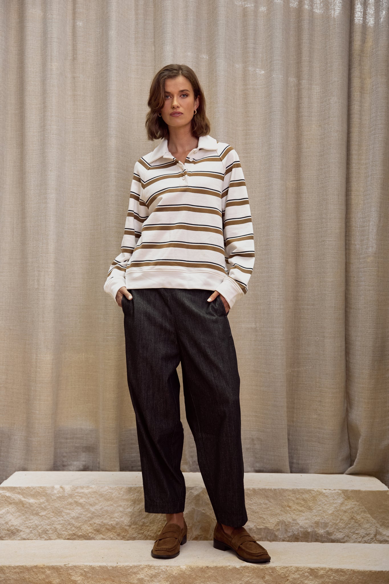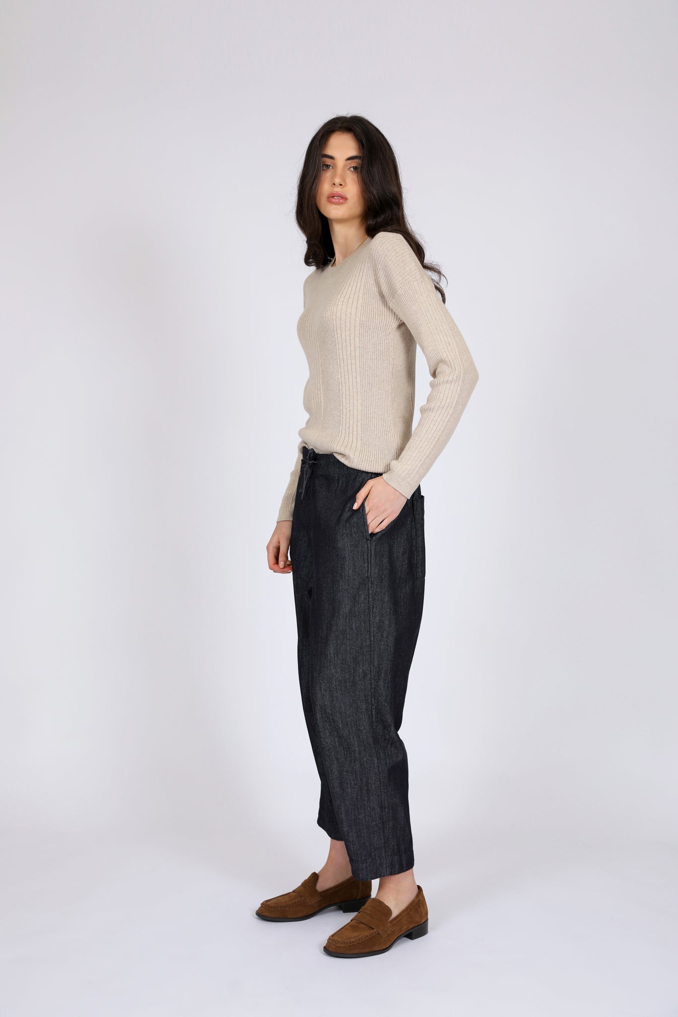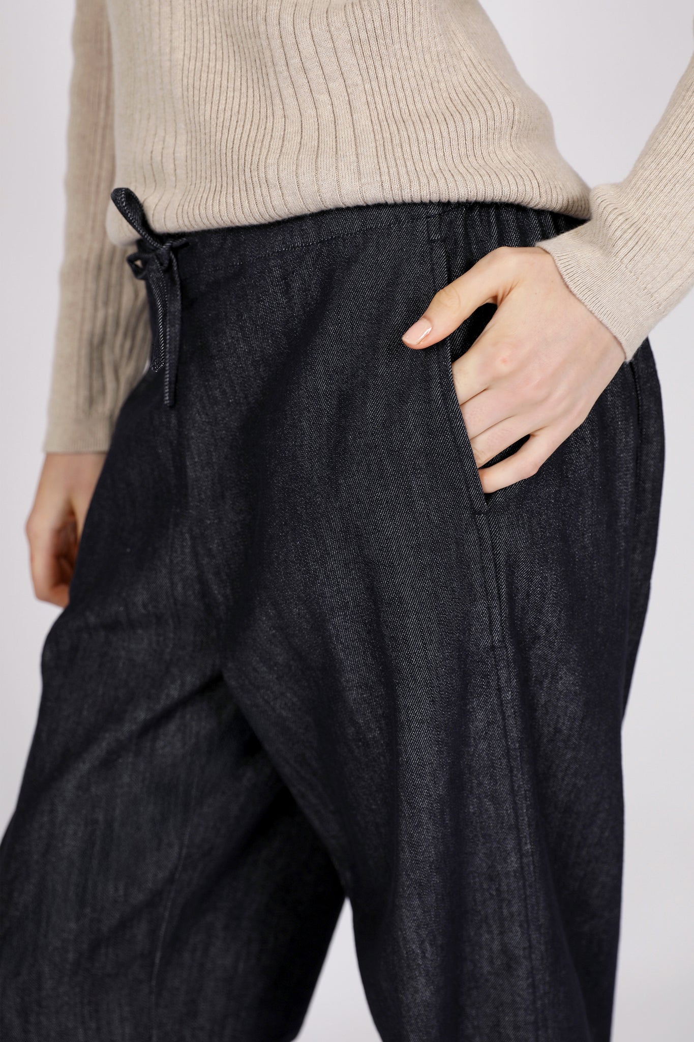 Meet your new favourite barrel pant - where the most-loved shape meets elevated comfort. Our Beam Barrel Pant in Dark Wash is crafted from 100% breathable cotton. Designed in a relaxed fit with a subtle barrel silhouette, it’s finished with knee darts for gentle shaping. The mid to high-rise waistband features a clean flat front, an elasticated back for ease, and an adjustable self drawcord to customise your fit.