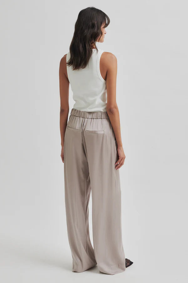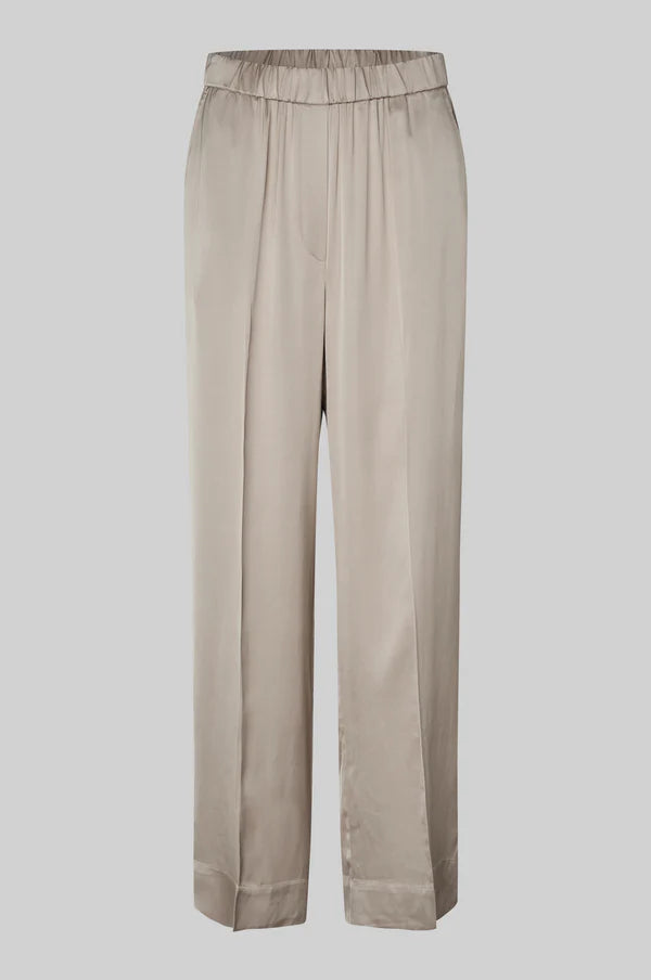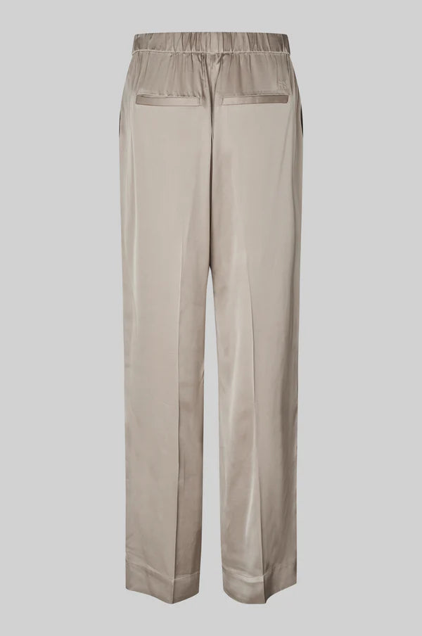 Second Female silky trousers. The trousers are made in a soft and drapy viscose with a lustrous quality. Featuring a covered elasticated waistband and decorative fly at the front. Two slanted pockets at the front and two decorative pockets at the back. Regular waist with straight, wide leg.