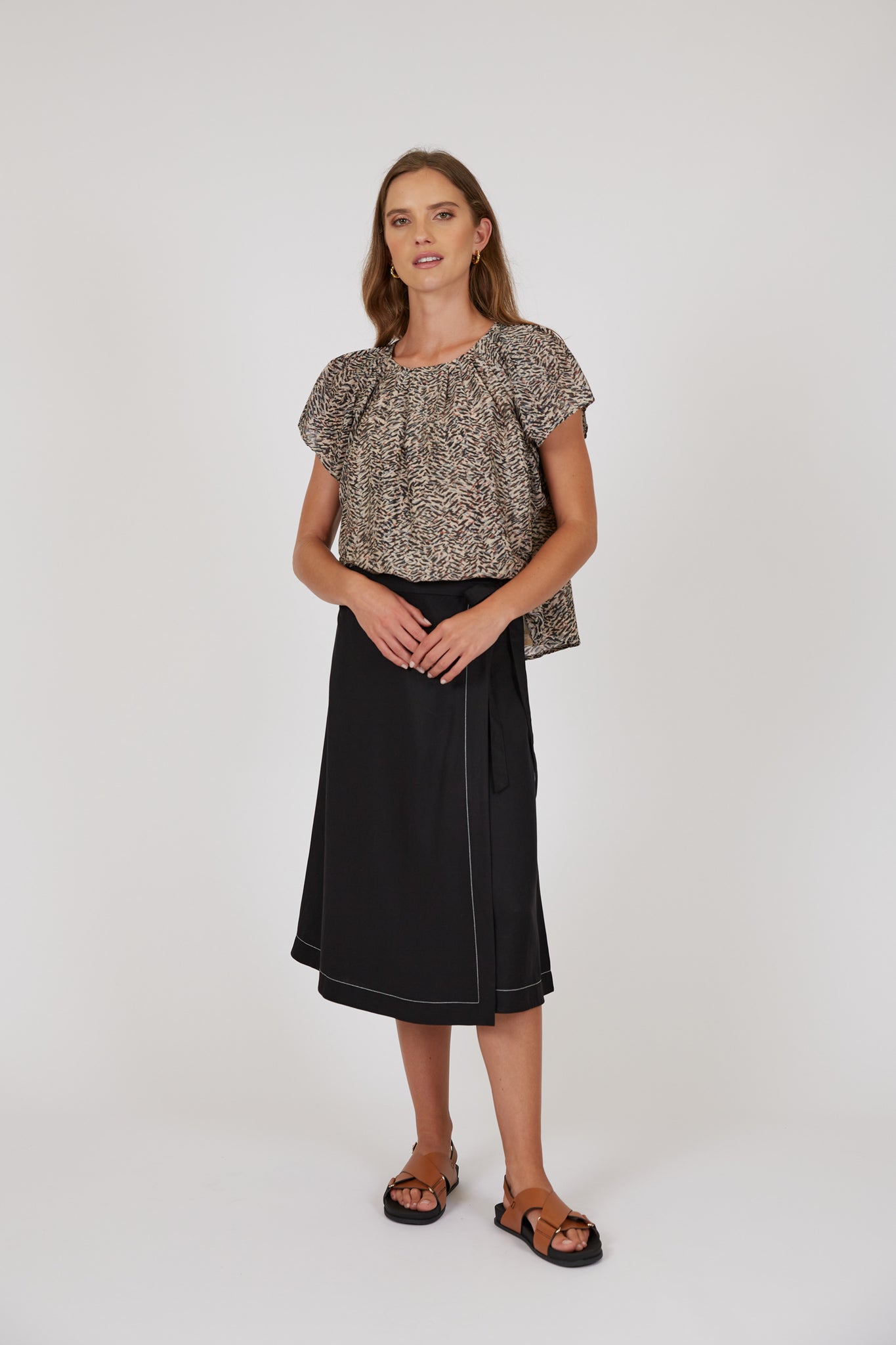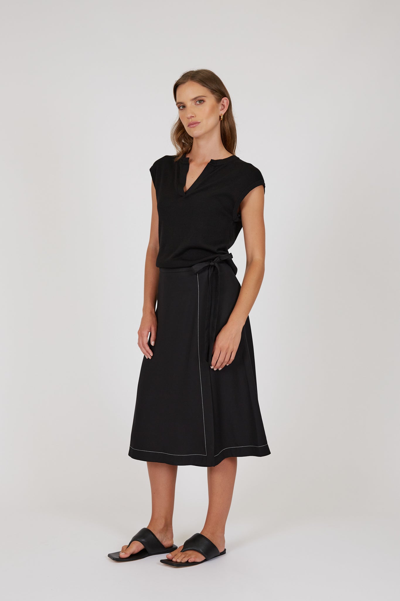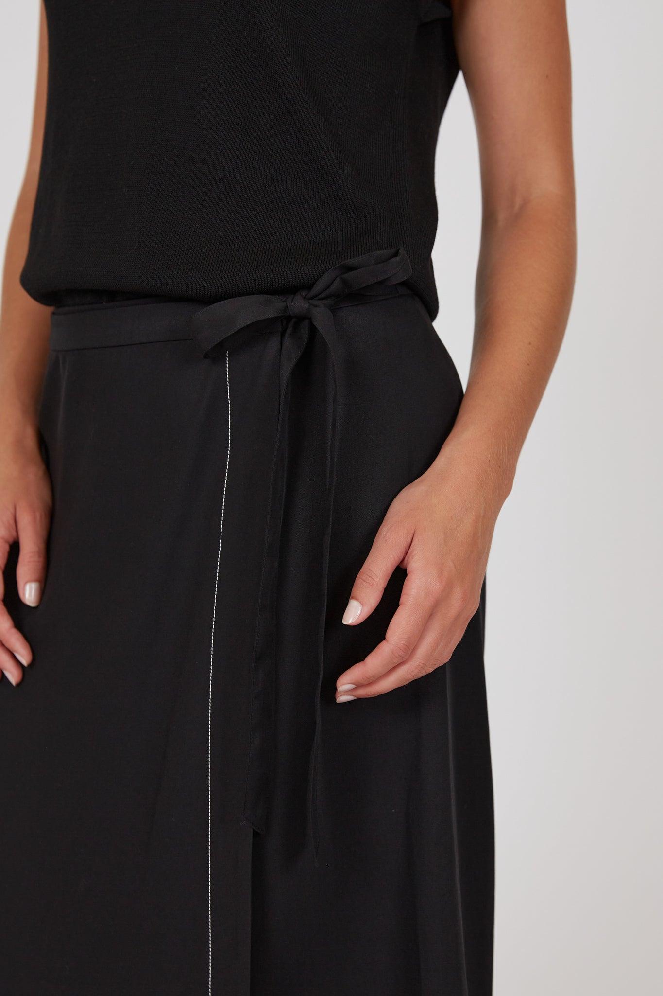 A versatile midi-length wrap skirt crafted from 100% Tencel, loved for its fluid drape and silky, lightweight feel. Designed for easy wear, this mid to high-rise skirt features two internal buttons to customise the fit, a side tie, and ivory contrast stitching for a refined finish. Throw it over swimwear for the beach or style it with heeled sandals and raffia accessories for an elevated evening look.