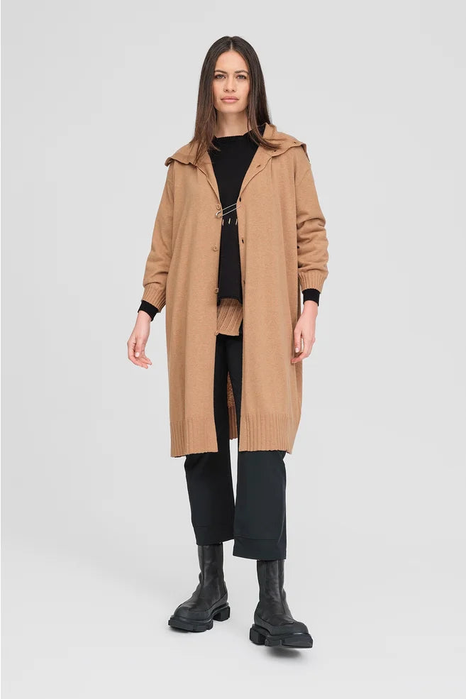 Long line shapes are a favourite for taylor silhouettes, especially cardigans. The Pinned Coat is a relaxed, mid-length shape with a hood for added detail. This fashion-forward, oversized jacket offers a relaxed fit. Featuring an exaggerated drop shoulder line, curved hemline, and generous hood. For ultimate comfort and versatility, wear with our Stitched Lucent Hoodie and a chunky sneaker.