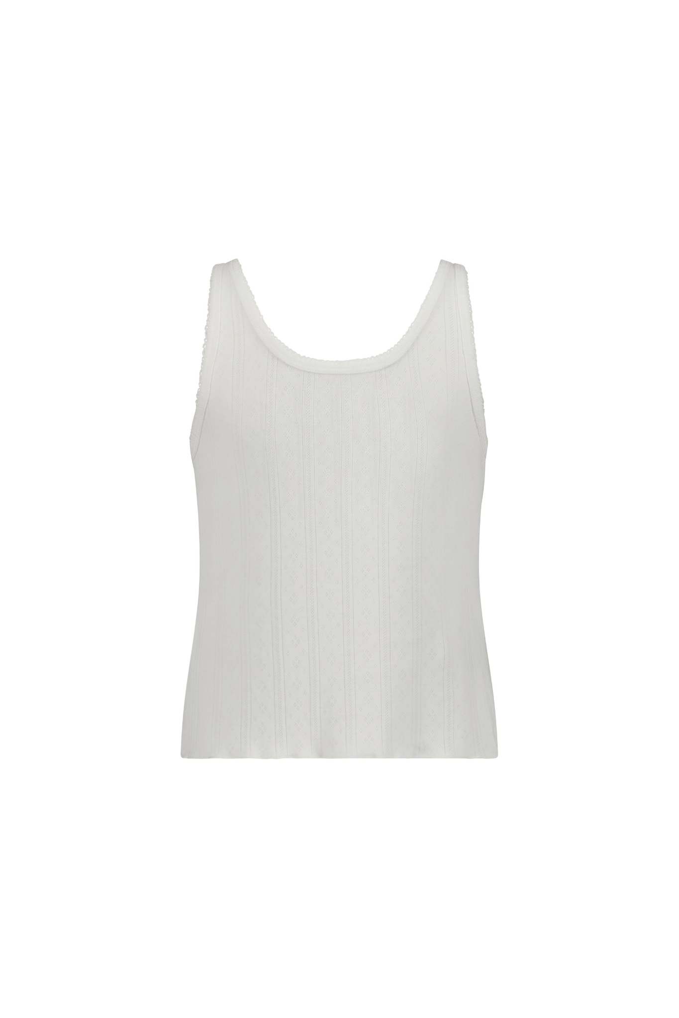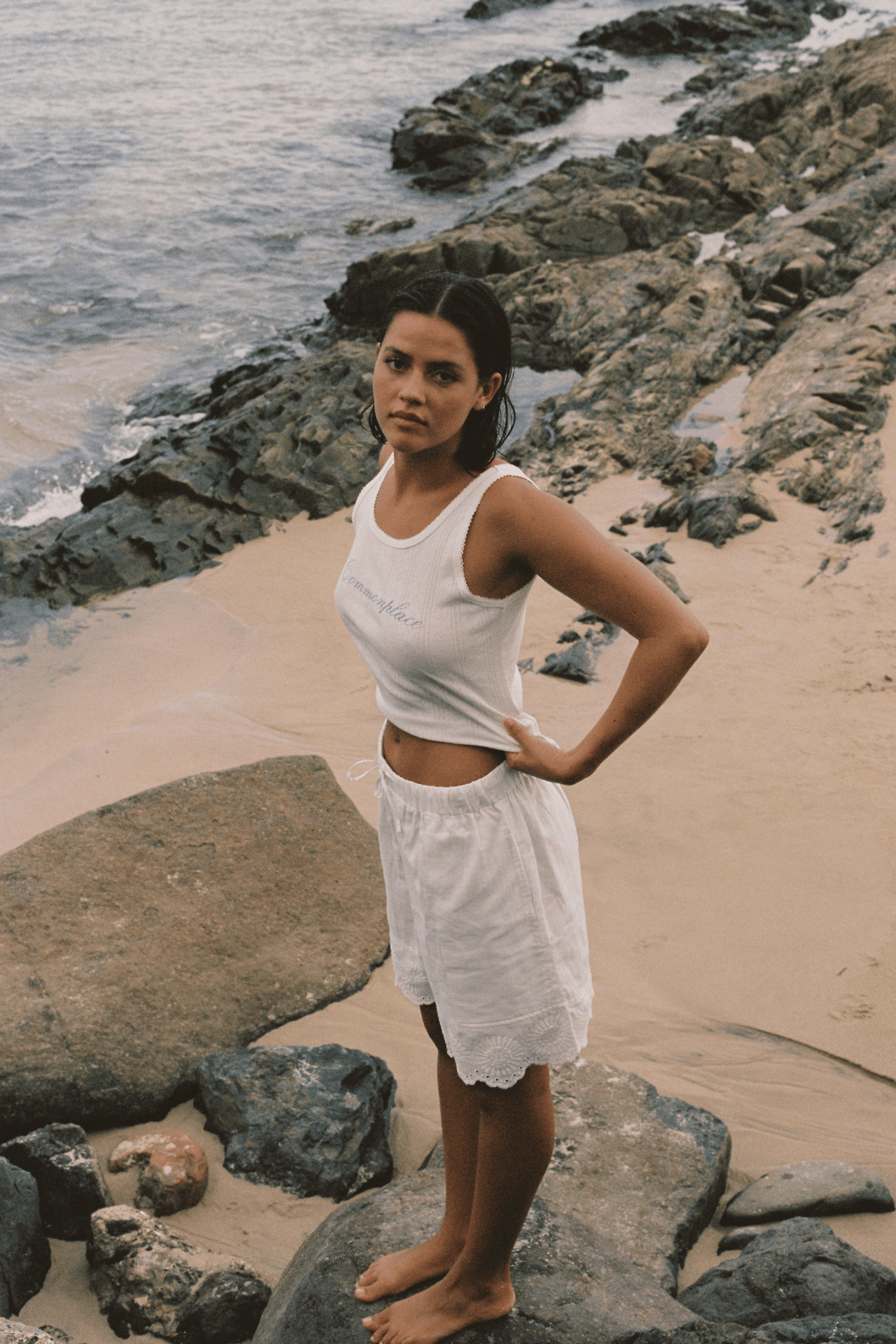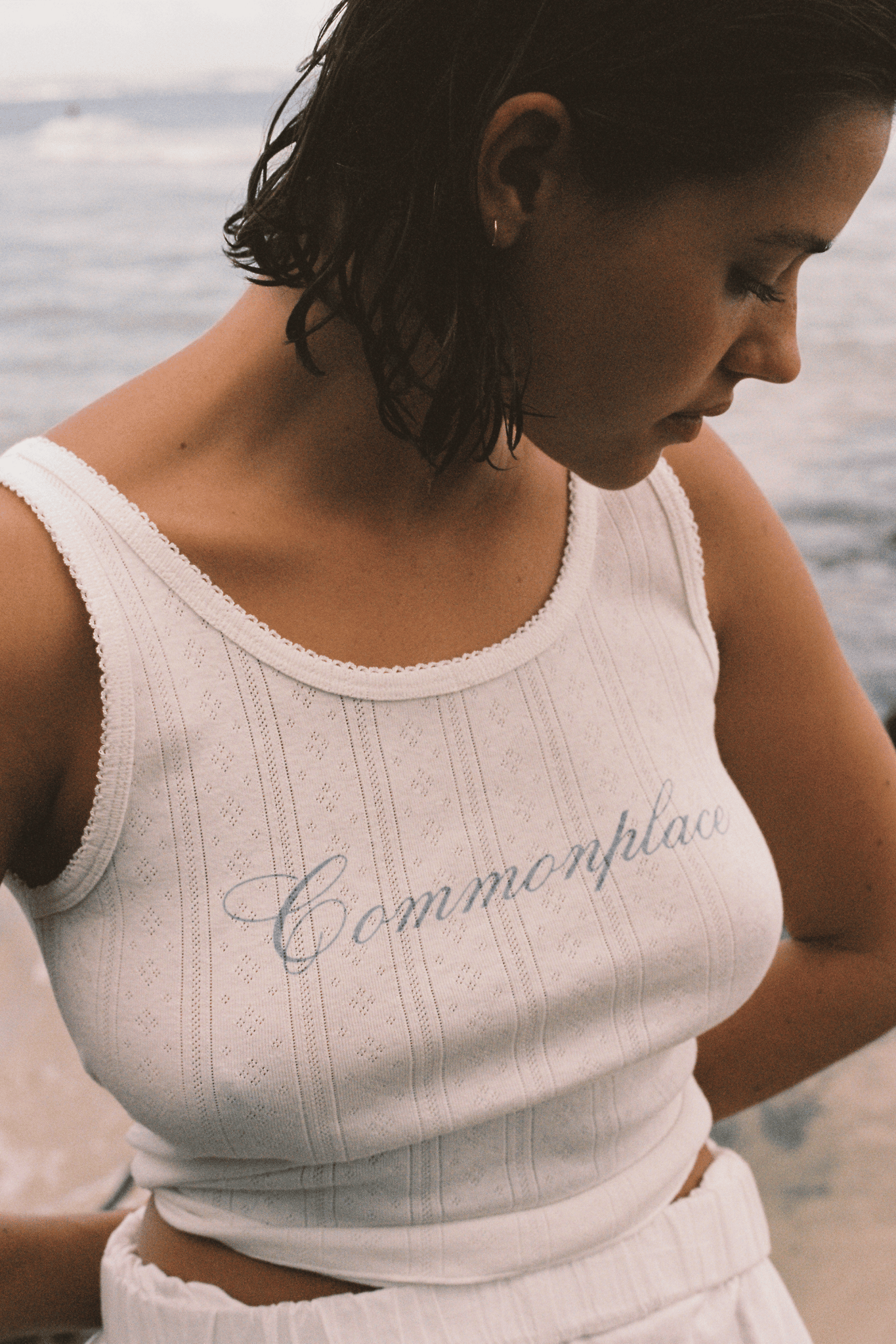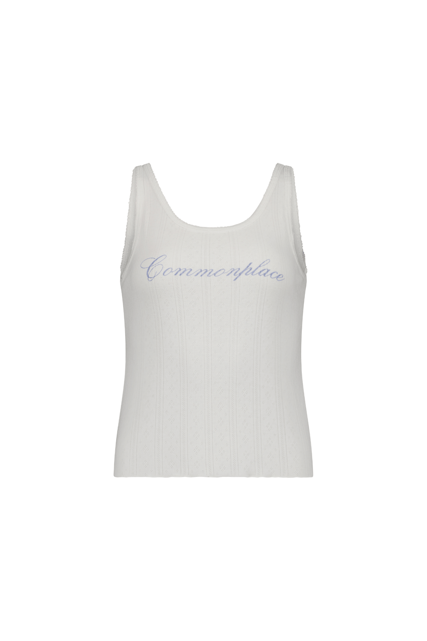A soft pointelle knit tank with subtle texture and a refined scoop neckline. Finished with our cursive logo in washed periwinkle for a touch of nostalgia. 100% cotton.