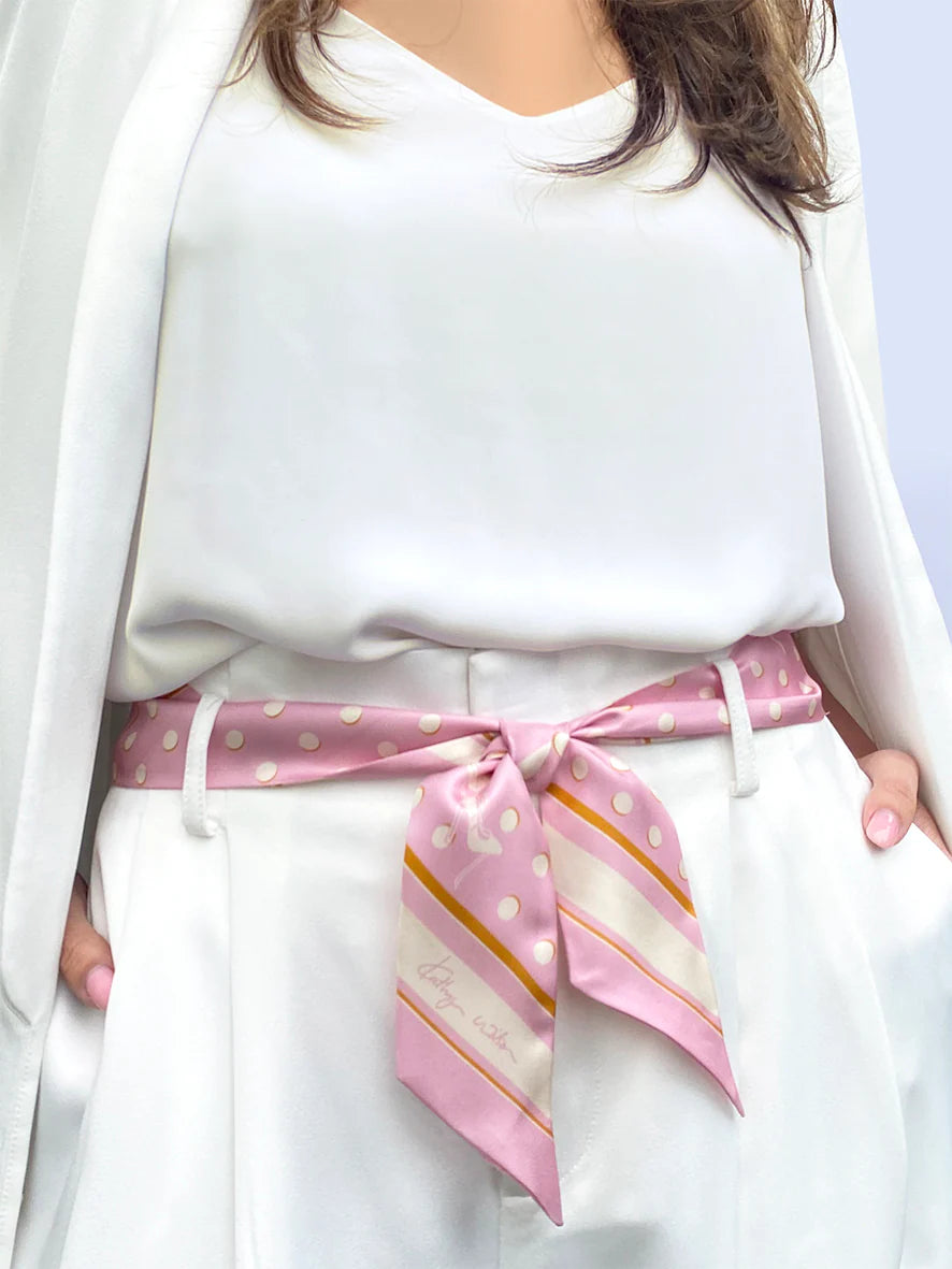 This exclusive design in pink and orange is created to perfectly complement Kathryn Wilson's SS24 range, and they offer endless styling possibilities. Whether worn around your neck, tied elegantly to your handbag, as a chic belt, around a hat, or even in your hair, these twillies are versatile, timeless, and luxurious.