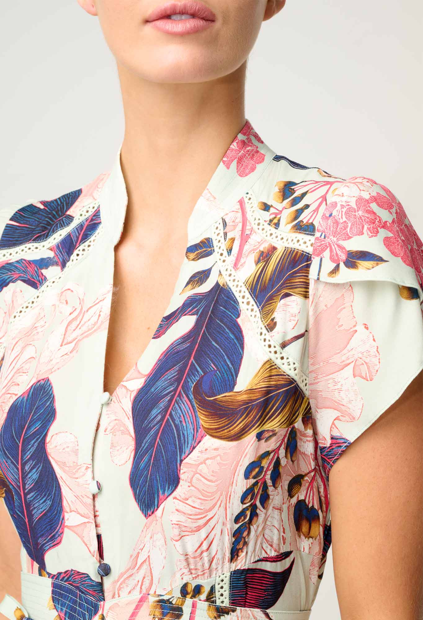 The vibrant Oasis Flora print, featuring a mix of bold botanicals in pink, coral, and deep navy against a soft mint base, captures the essence of modern femininity. A V-neckline and softly capped sleeves offer a flattering silhouette, while the detachable waist tie allows you to cinch your shape or wear it loose for relaxed sophistication. The midi-to-maxi length with subtle volume creates graceful movement, making it equally suitable for daytime events, summer holidays, or evening gatherings.