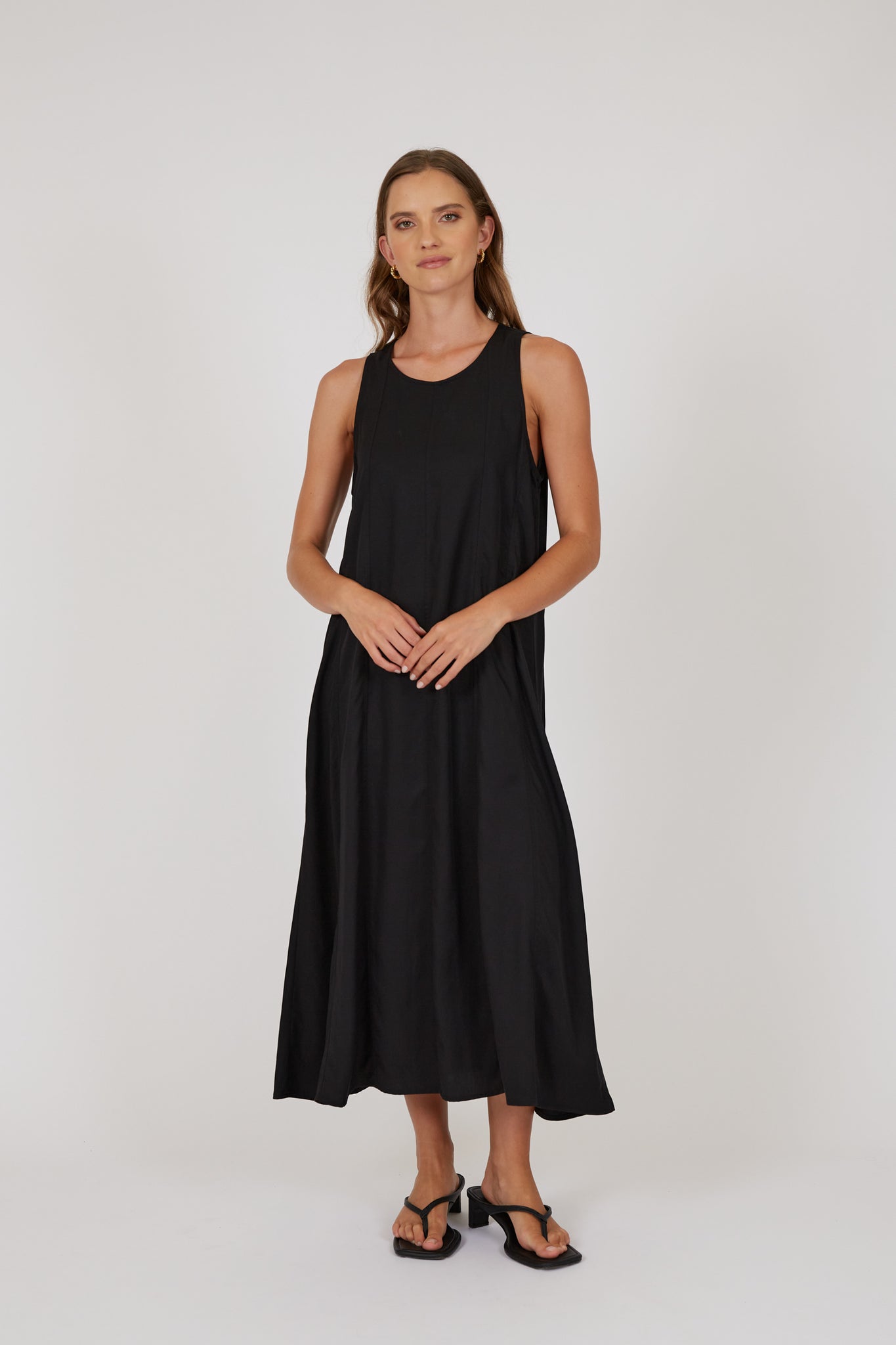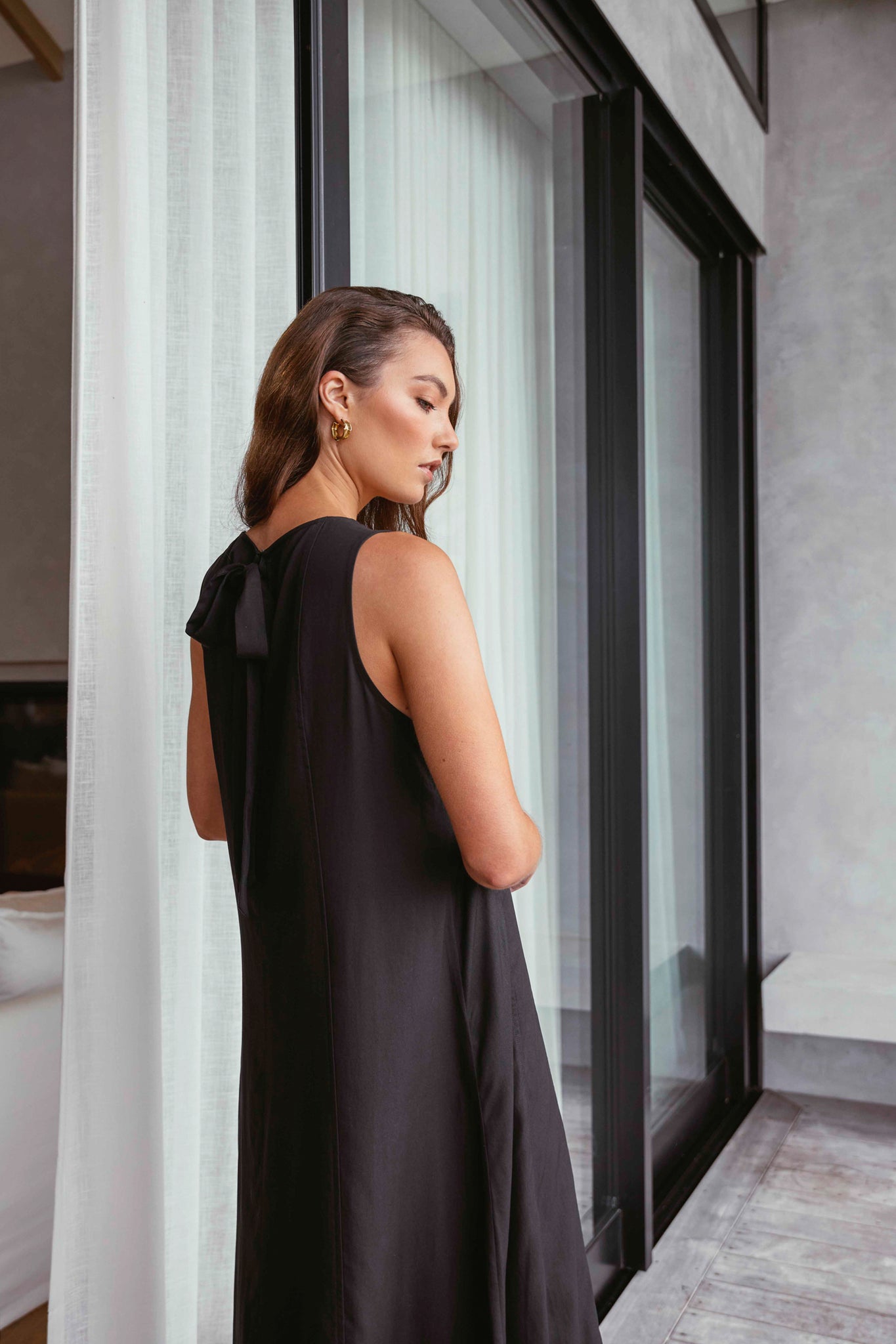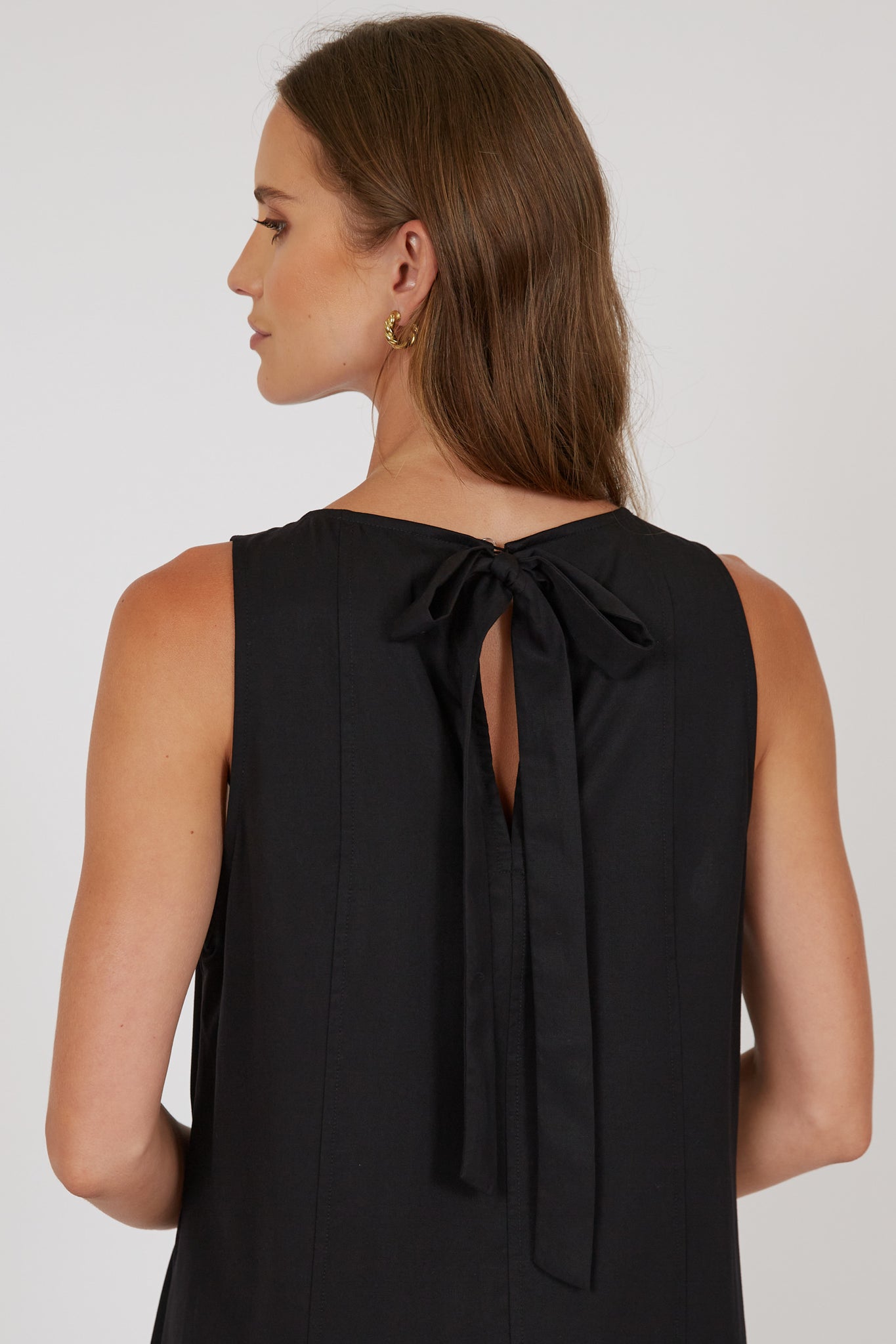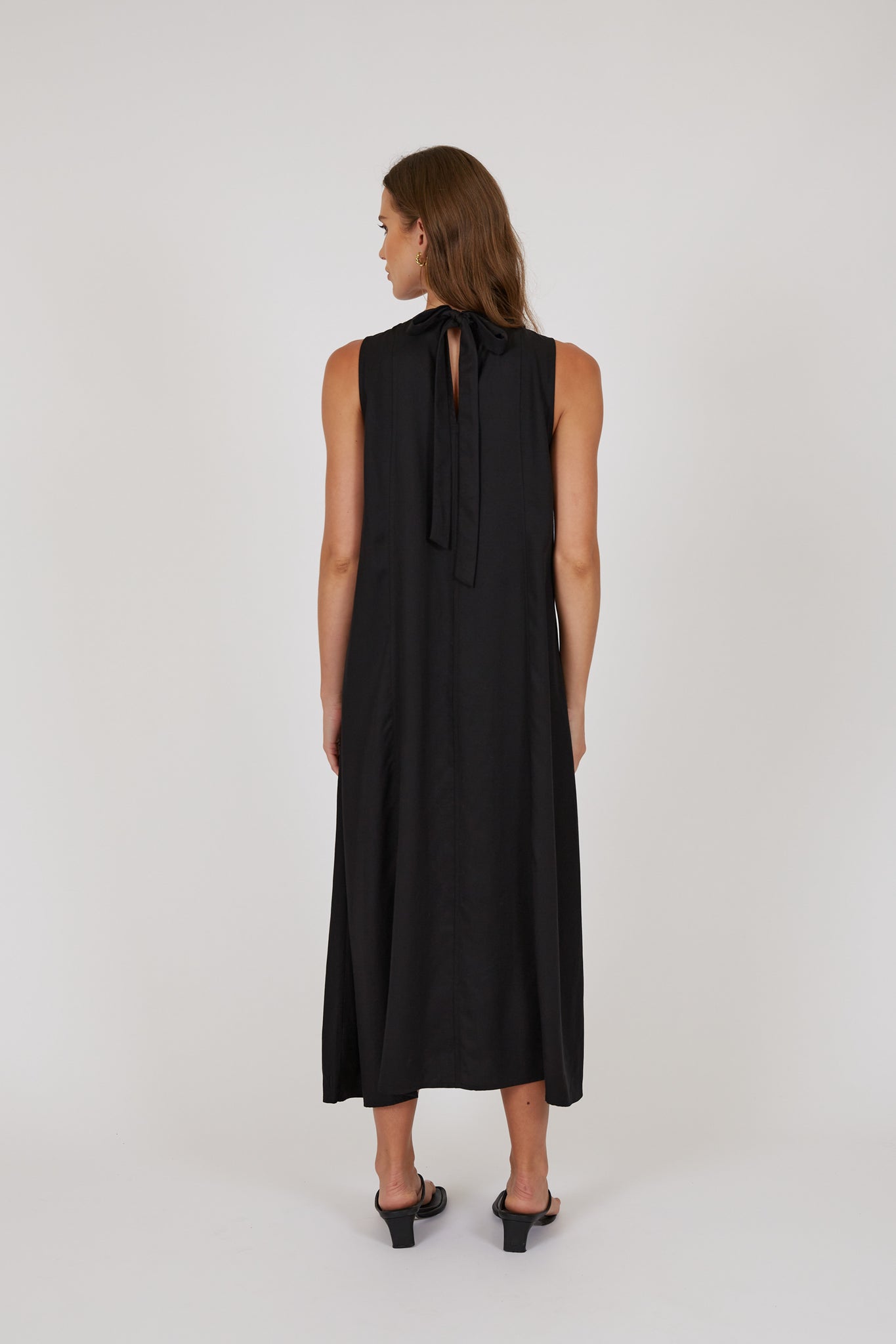 The Palma Dress is your effortlessly polished summer staple - relaxed, flowy, and designed to drape beautifully with every step. Crafted from 100% Tencel for a soft, silky feel, this midi-to-maxi style moves seamlessly from day to night. The sleeveless design and crew neckline create a clean, modern look, while the back keyhole closure and statement fabric bow add a refined touch. Style with slides and a raffia bag for brunch, or elevate with heeled sandals and a clutch for event season.