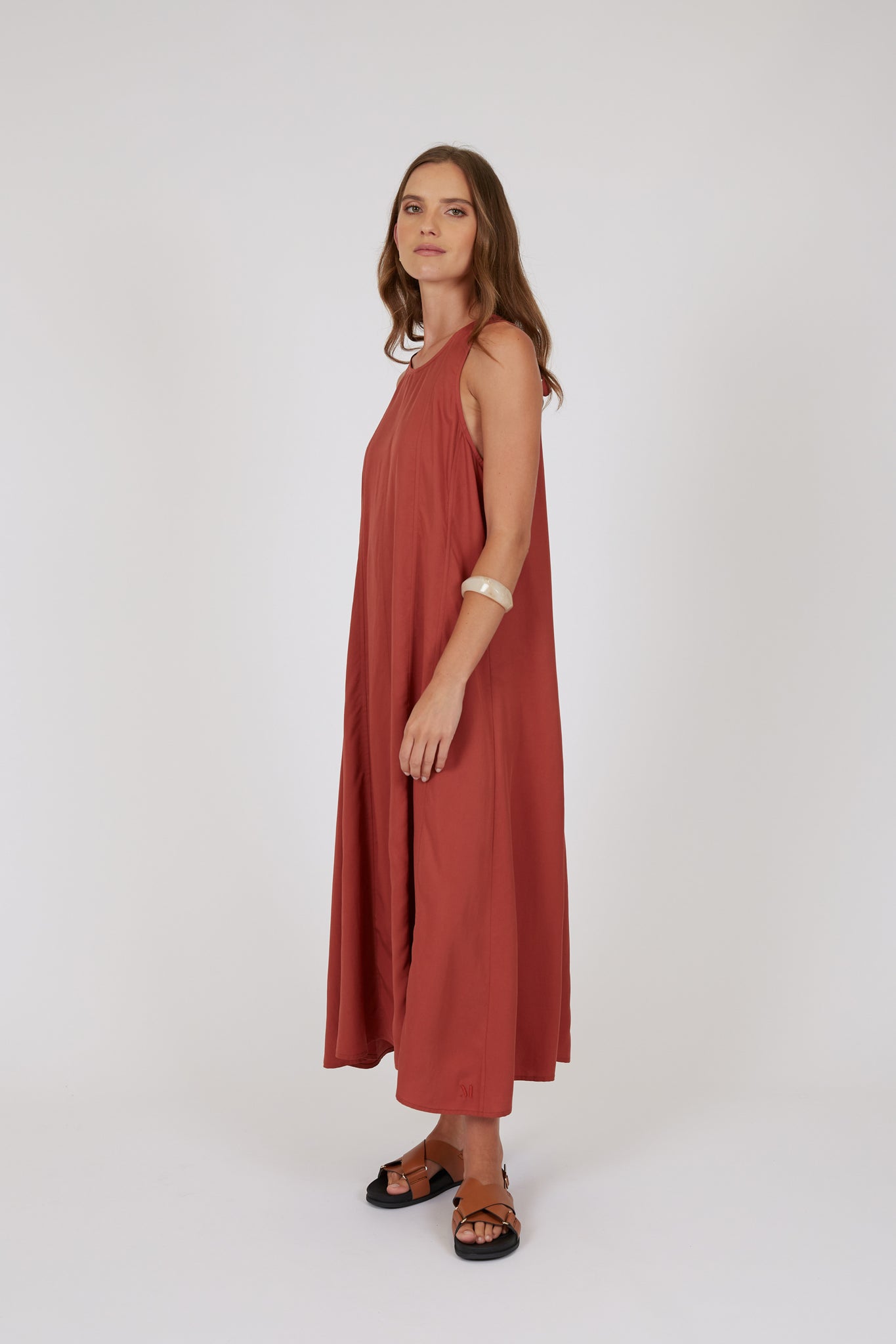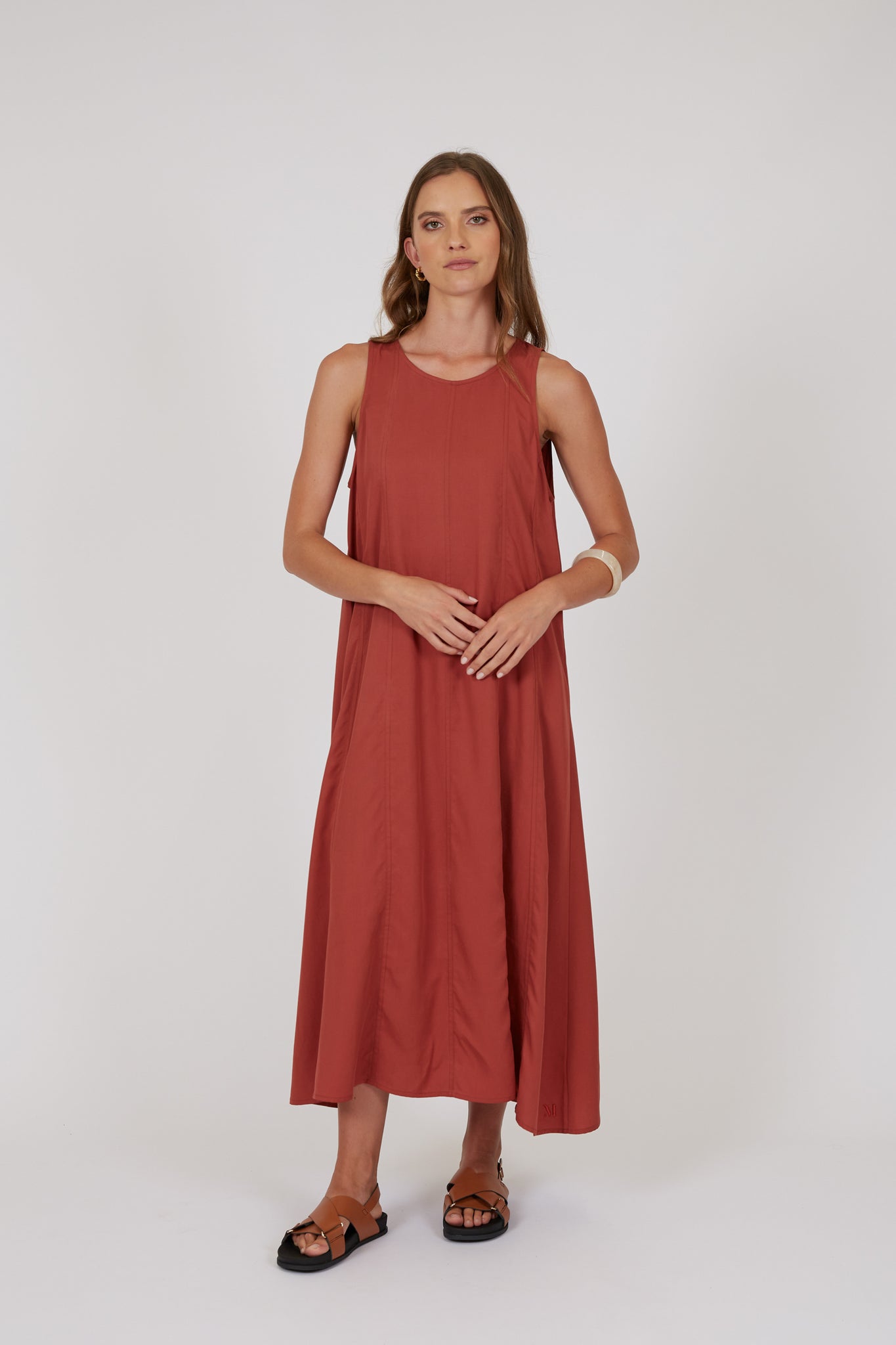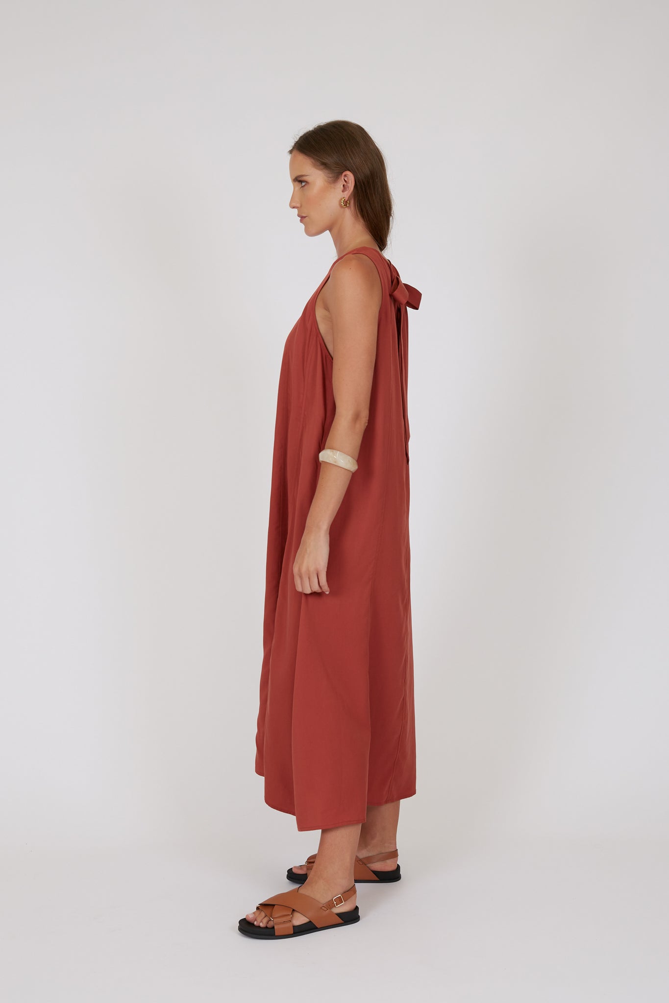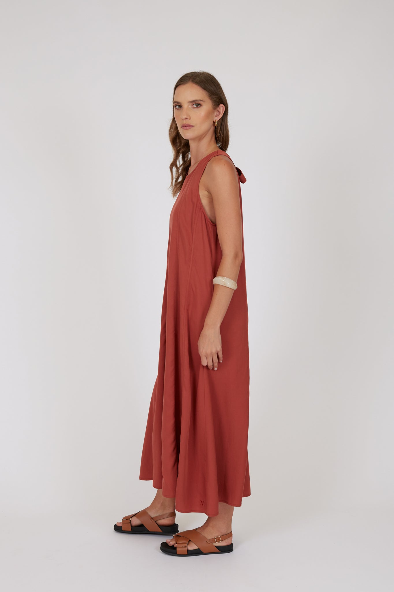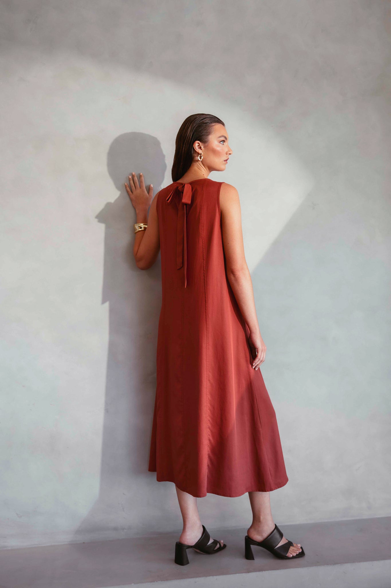 The Palma Dress is your effortlessly polished summer staple - relaxed, flowy, and designed to drape beautifully with every step. Crafted from 100% Tencel for a soft, silky feel, this midi-to-maxi style moves seamlessly from day to night. The sleeveless design and crew neckline create a clean, modern look, while the back keyhole closure and statement fabric bow add a refined touch. Style with slides and a raffia bag for brunch, or elevate with heeled sandals and a clutch for event season.