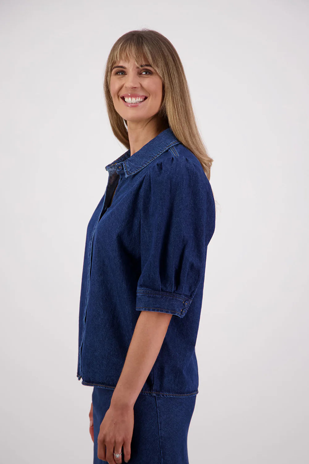 Stella is a unique denim shirt with flattering elbow length puff sleeves setting it apart from others. The slightly fitted shape is very flattering on