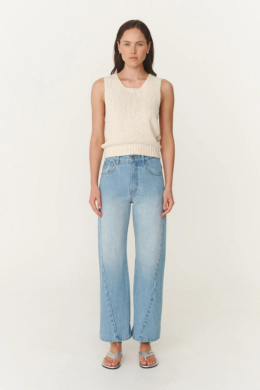 A directional take on everyday denim. The Percy Jean features a faded wash, twisted seams, and a slight barrel leg for a structured yet relaxed fit.