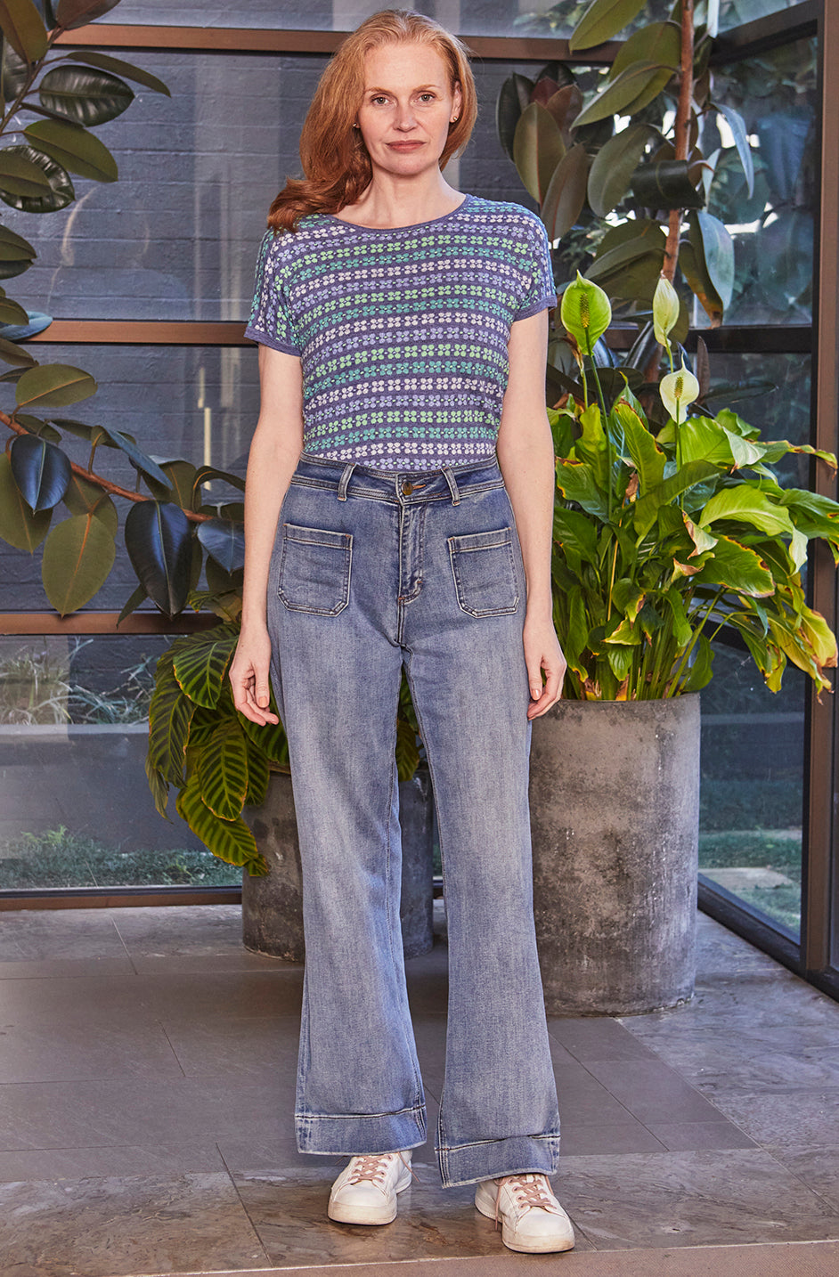 98% Cotton 2% Spandex – Cool high waisted, wide leg, full length jean. Has front patch pockets. This cut flatters every figure. 28cm rise. 31inch inseam.