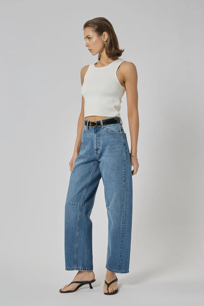 A high-rise Barrel Jeans crafted from sturdy 100% Cotton Denim. A relaxed curved leg that continues to the ankle and gives an elevated look if styled with heel or pointy flats.