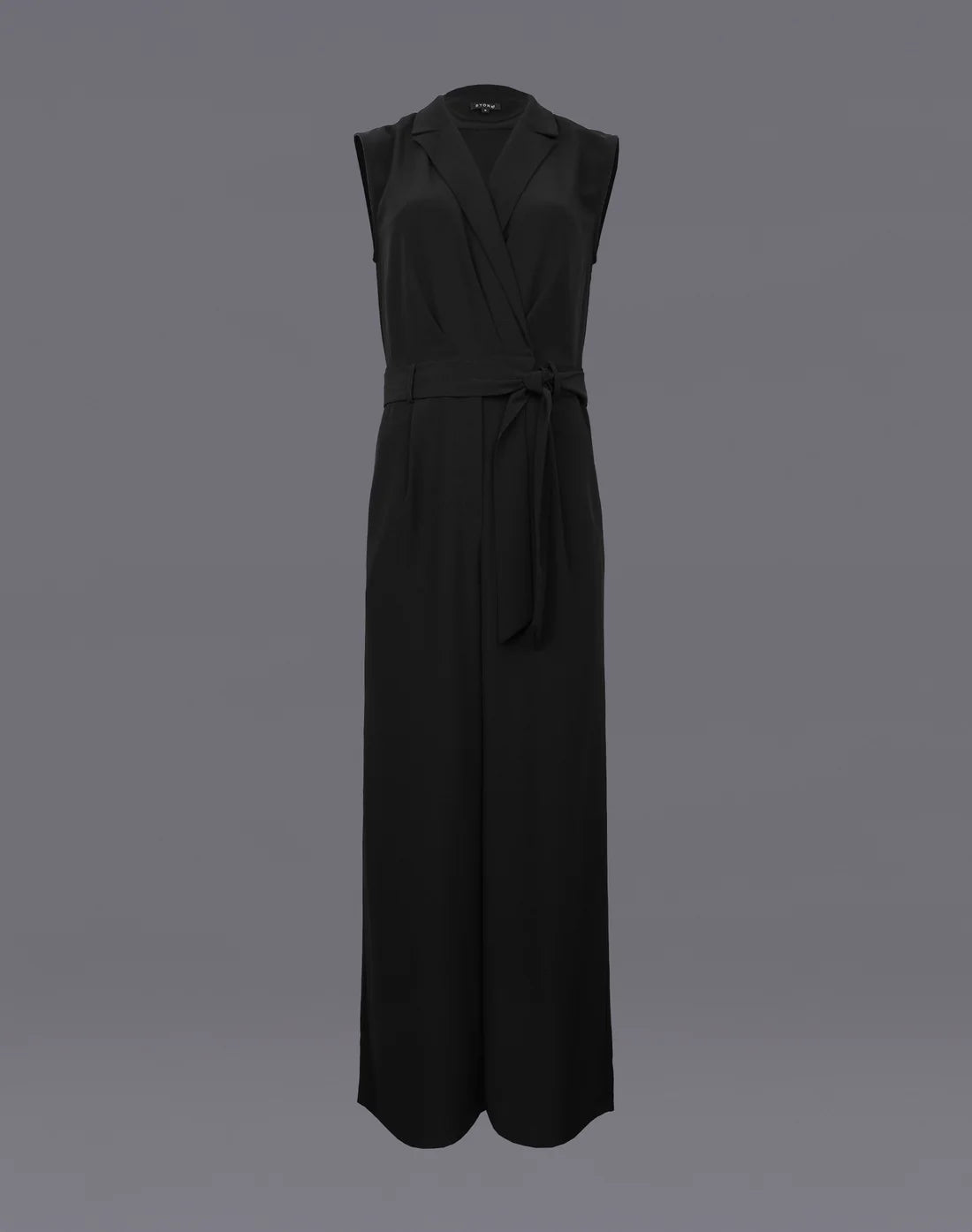 Sleeveless with wider leg, featuring a crossover bust and suiting style lapel. The tie belt marks the softly pleated waist.