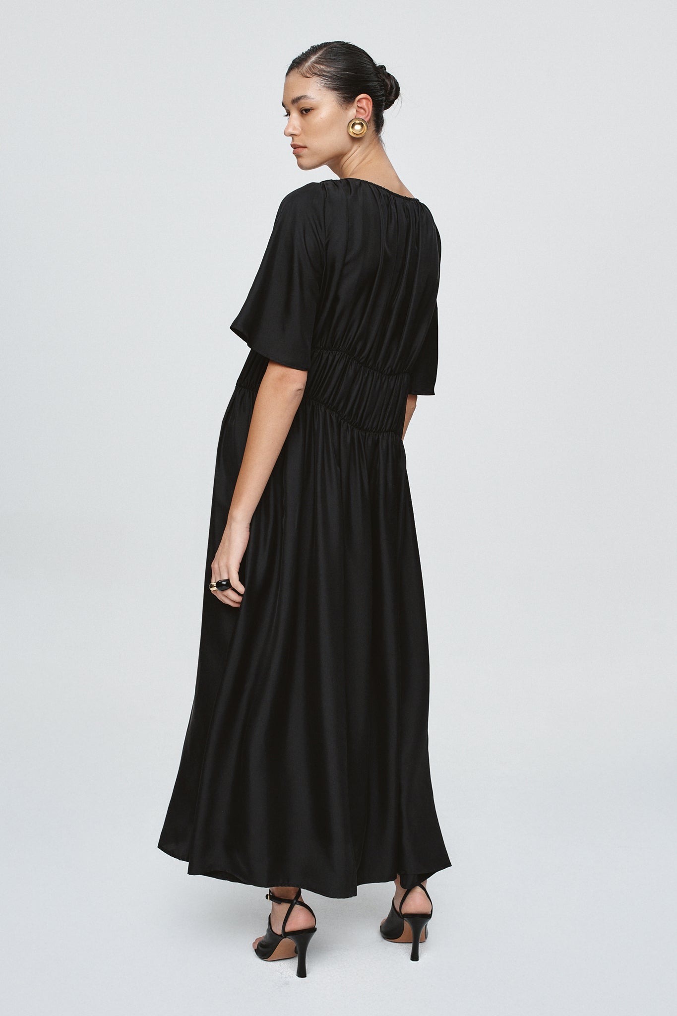 The Dieter Dress is cut from 100% Tencel, offering a soft, sustainable drape with a subtle sheen. Designed with gathered elasticated channels across the bodice and waist, it creates a softly defined shape while maintaining comfort and ease of movement. The round neckline and wide short sleeves lend a relaxed balance to the sculpted midsection, while the full skirt falls to mid-calf, moving fluidly with the body.