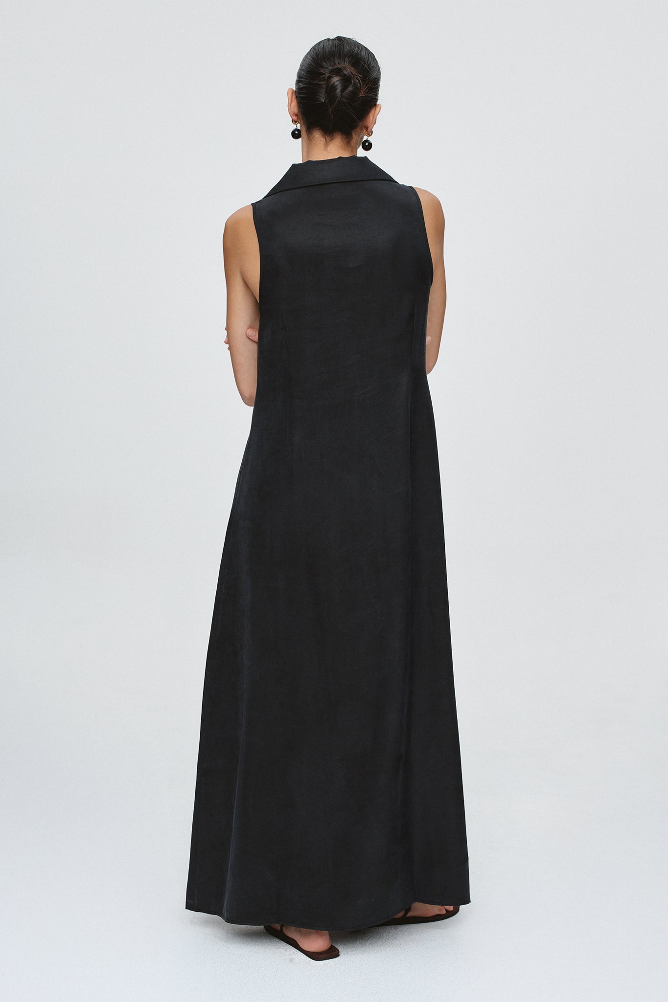 Sleeveless full length dress cut in 100% Lyocell. Pointed collar with deep V-neckline. Full-length front placket with contrast shell button closure in a paired formation.Fitted bodice with dart shaping through the waist. A-line skirt with a clean hem finish.