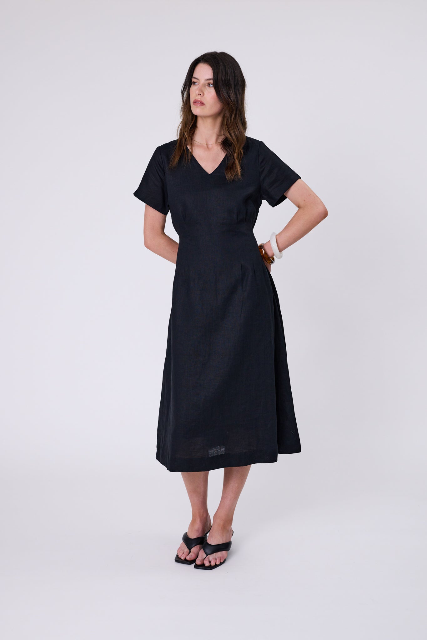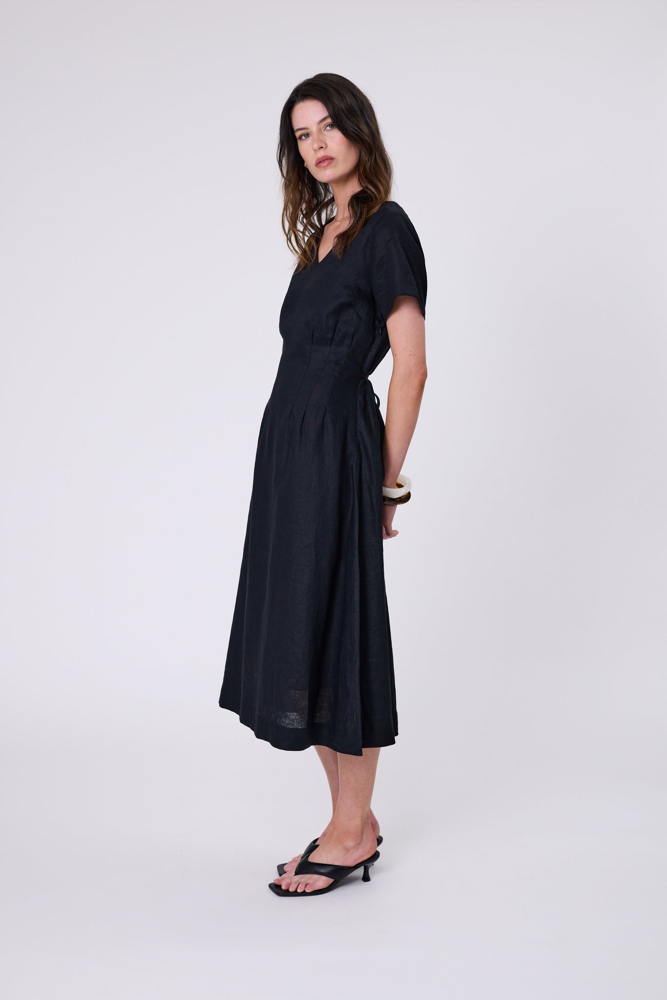 Sophisticated yet effortless, the Seville Linen Dress offers an elevated refresh of our best-selling silhouette. Cut from premium European linen with a naturally refined drape, it features a V-neckline and back, short sleeves, and shaping darts through the waist. The adjustable self-ties can be fastened at the front or back to create a personalised fit for every occasion. Pair with flat sandals for lunch at the vineyard, or dress up with heels and a clutch for a polished evening look.