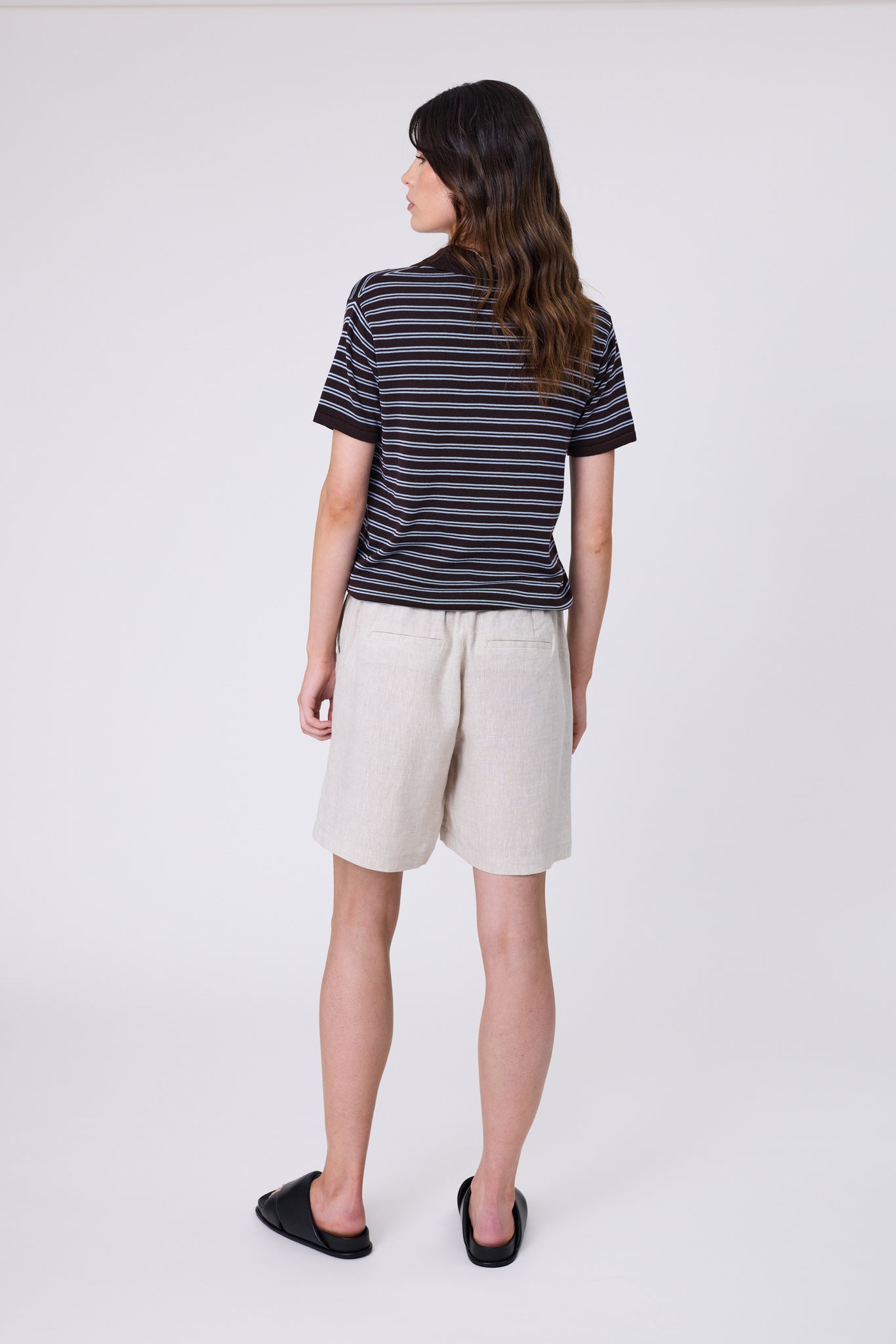 Relaxed yet refined, the Vista Bermuda Short offers a fresh take on a classic. Crafted in crafted from premium, refined European linen, it blends relaxed comfort with structure in a tried-and-true silhouette. Designed with a mid to high-rise fit, it falls just above the knee for a flattering longline look. The classic front waistband with button, fly, and belt loops adds polish, while an elasticated back waistband keeps things comfortable. Finished with angled side pockets and faux back welts, this short strikes the perfect balance between tailored and laid-back.