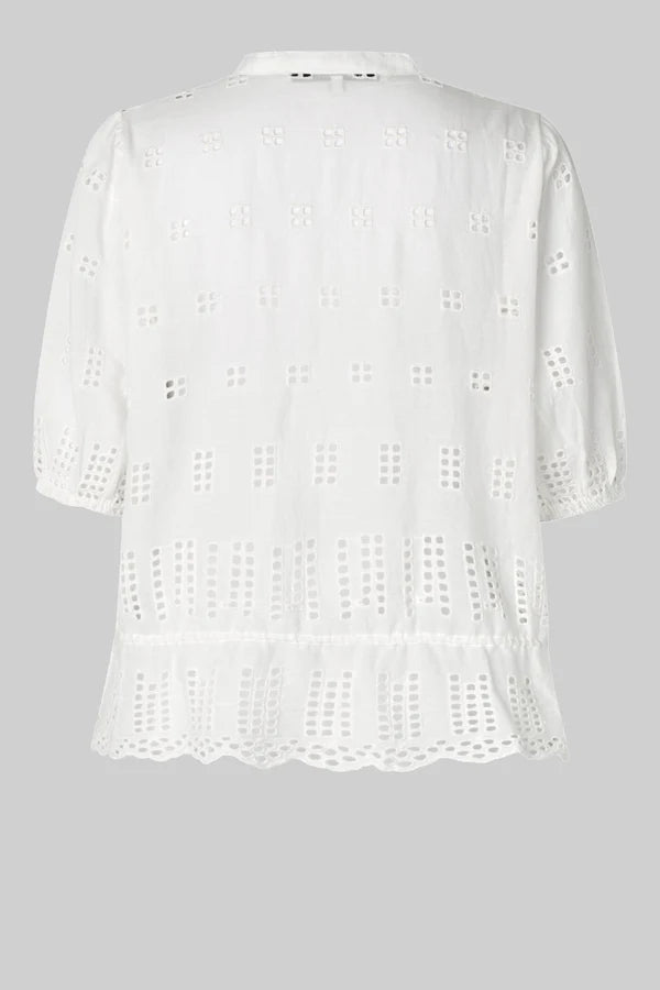 Second Female short-sleeved shirt. The shirt is made in light cotton with a semi-sheer quality and all-over square broderie anglaise. Featuring a button-through fastening and drawstring tie at the waist that creates a peplum effect. Scalloped bottom hem. Loose fit that can be pulled in at the waist
