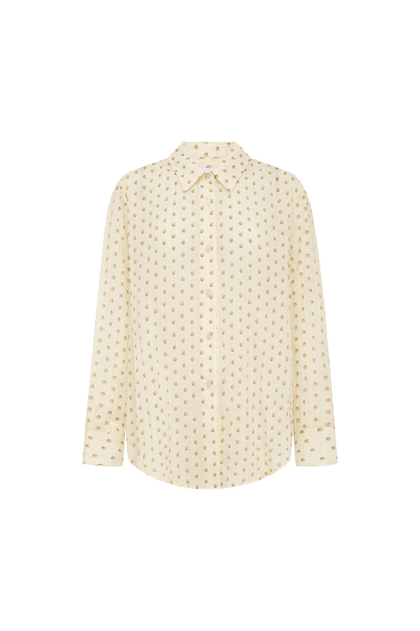 A semi-sheer silk–cotton shirt with a natural vertical crinkle, finished in our custom vanilla spot print. With its relaxed drape and airy feel, it adds quiet texture to everyday dressing.