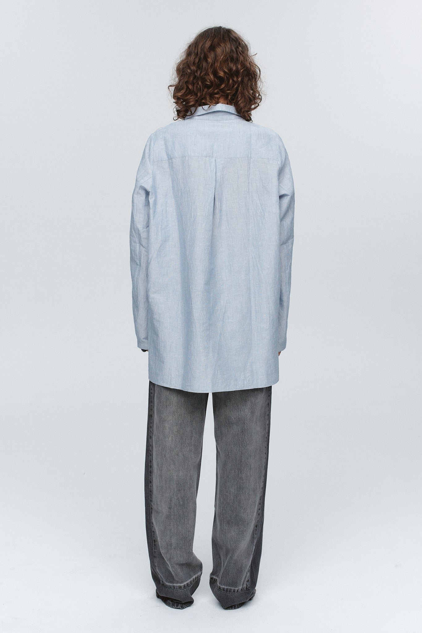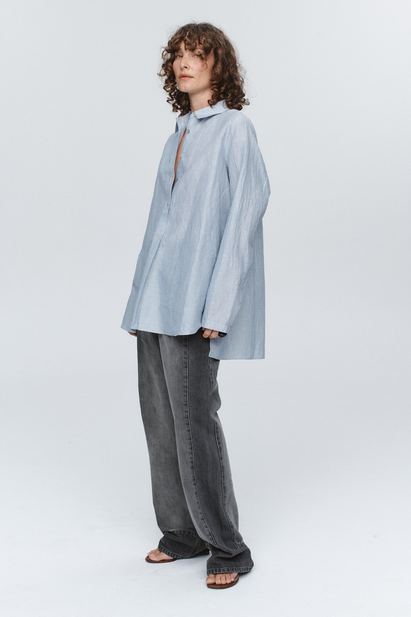 Crafted in a lightweight cotton–linen cloth, with a subtle textures stripe, this shirt is cut to an oversized shape that drapes with ease. It features a structured collar and a 5 button placket at the centre front for a clean, uninterrupted line. Set-in sleeves that fall to a hemmed cuff enhance the relaxed fit, while the curved hemline softens the shape and invites layering.