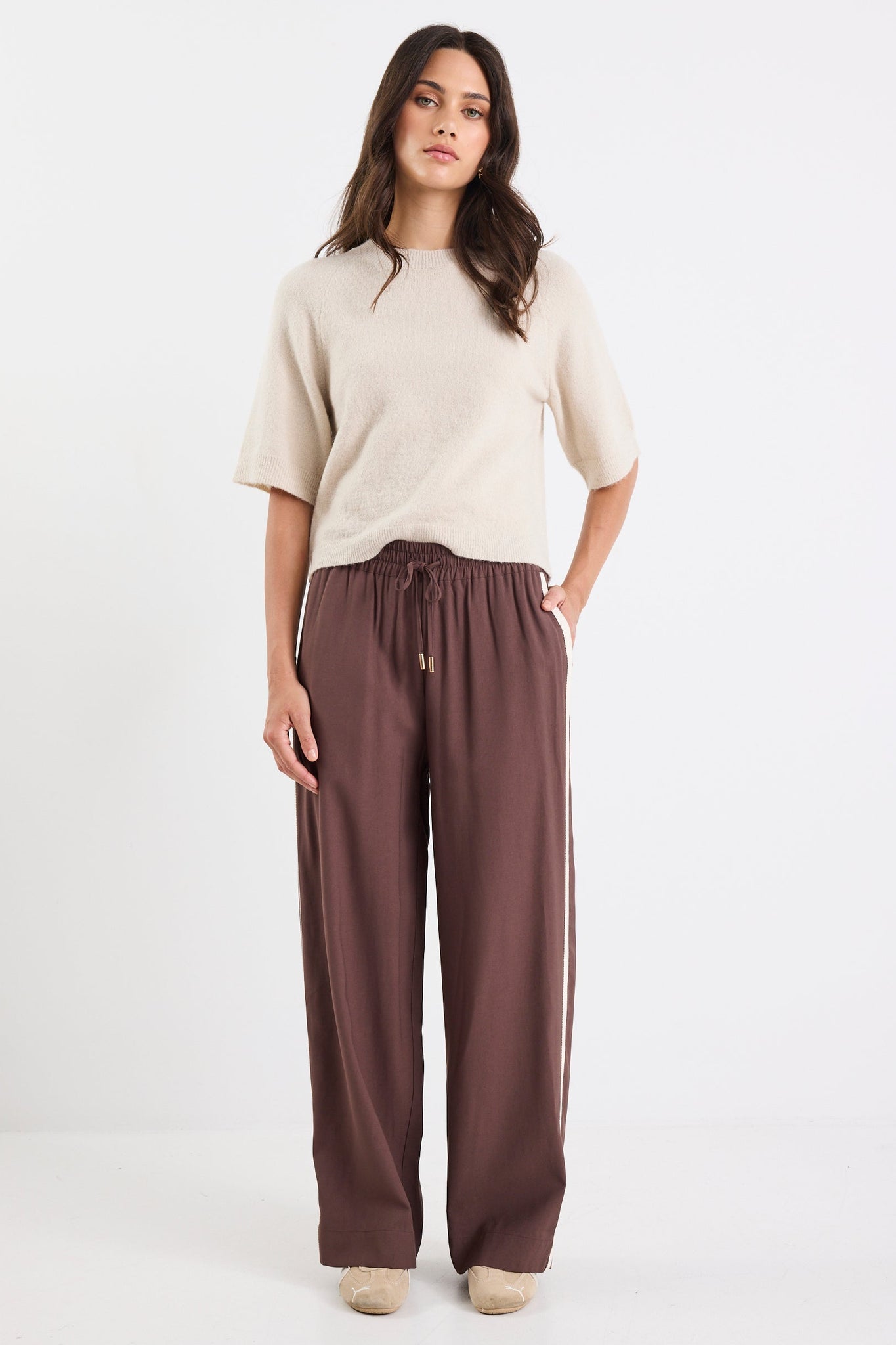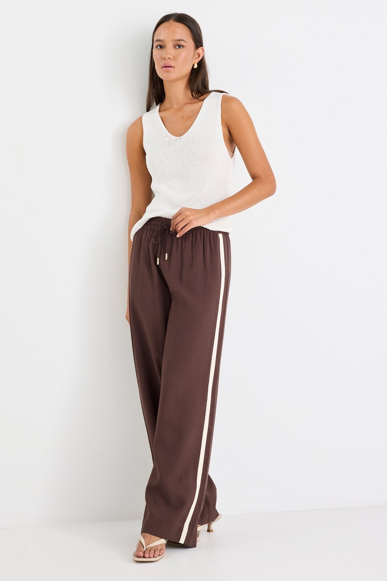The Townie Chocolate Wide Leg Pant from Stories Be Told effortlessly combines everyday style with comfort. The relaxed, wide-leg style makes them a staple for those seeking a stylish and functional piece to transition from day to night. Crafted from a soft viscose blend and an elastic waistband with a drawstring, these pants are designed to flatter various body types.
