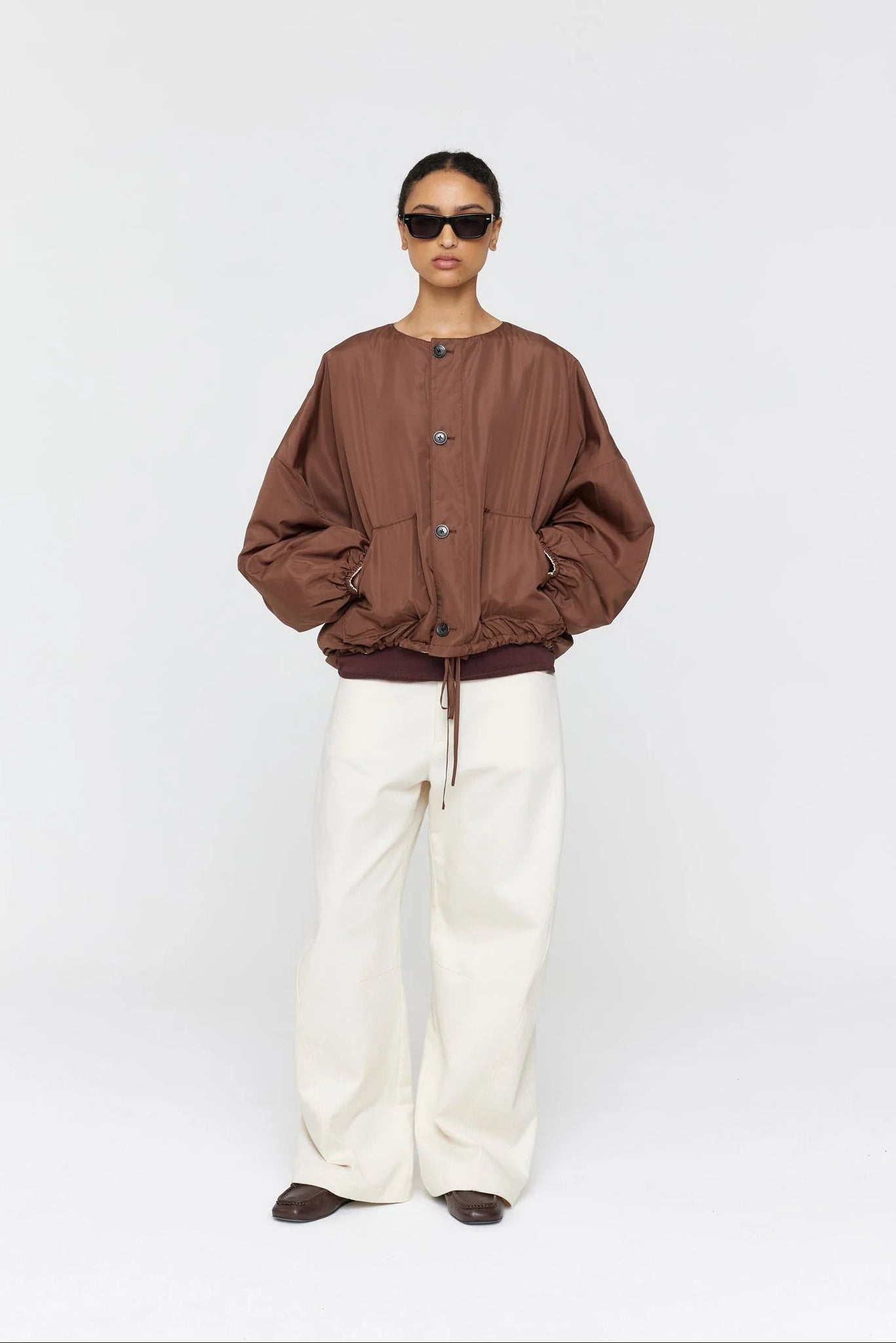 Stay warm and stylish with our Padded Forster Jacket. This quilted jacket is lightweight and features two large contrast patch pockets for convenience. The generous, dropped shoulder fit is complemented by contrast binding edges. Cropped length with fine drawstring ties on the waist. With its reversible design, the jacket is quilted on one side and lightly padded on the other. This jacket is perfect for any occasion.