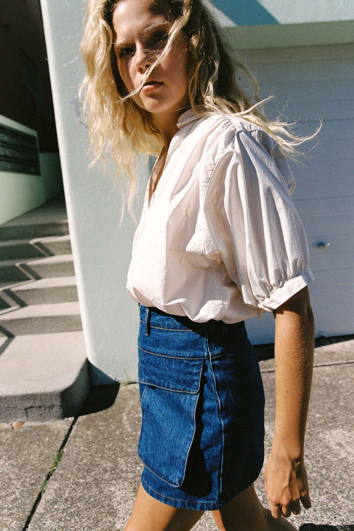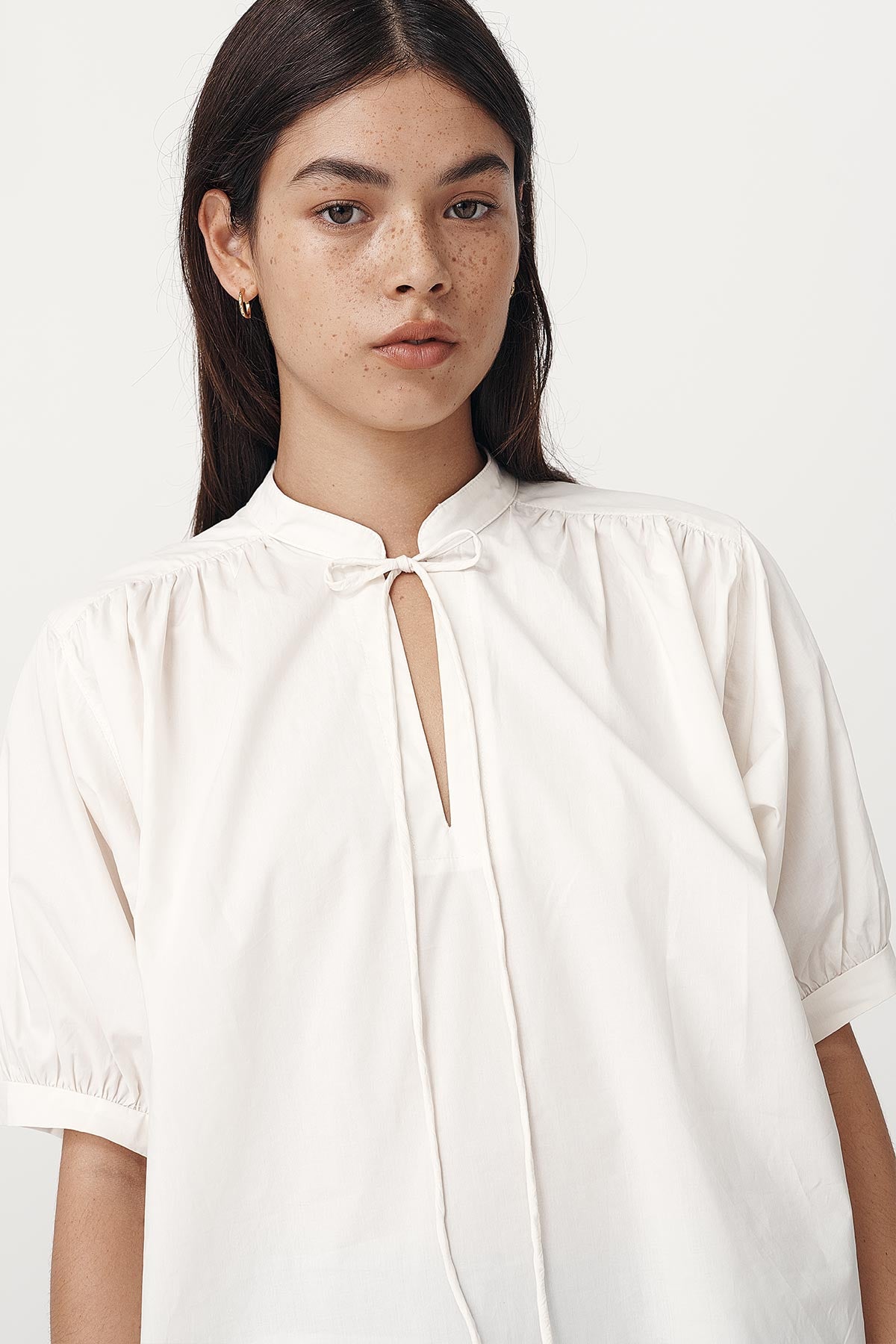 A relaxed organic cotton blouse featuring a mandarin collar with a soft tie neckline and voluminous sleeves gathered at the cuffs. Easy and refined, it brings an understated shape designed for everyday wear.
