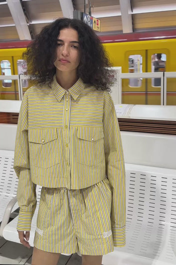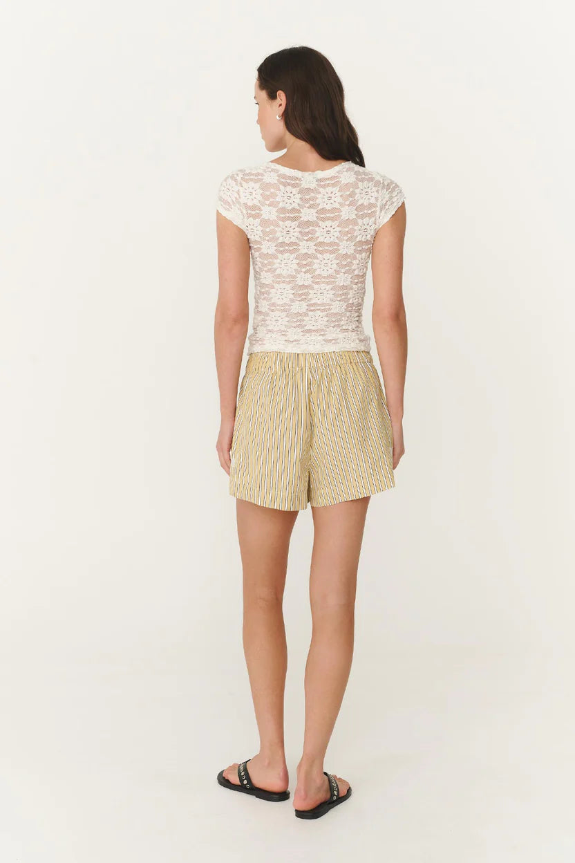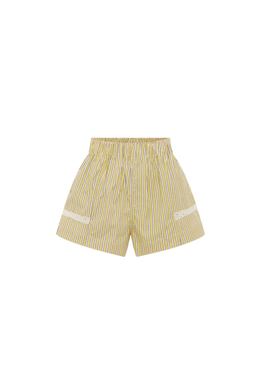 The Rocco Shorts return in Sunflower. A boxer-inspired cut with lace inserts, side seam pockets, and a high-rise elastic waist