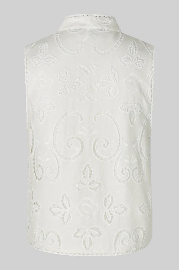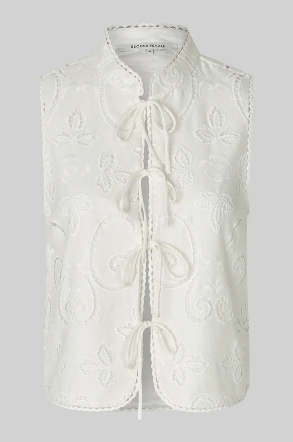 Second Female sleeveless lace top. The top is made in a light and soft viscose-linen blend with all-over lace details. Featuring a mandarin collar and four sets of ties that fasten in the middle. Scalloped bottom hem. Regular fit.
