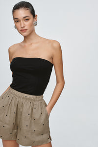A relaxed pull-on short crafted from semi-sheer Ramie cloth with 100% Cotton lining, offering a soft yet structured hand feel. The fabric is delicately woven with a contrasting black square dot motif. The Alisa Short features an elasticated waistband, generous side pockets and a clean blind hem. Designed to sit mid-rise with a softly flared leg, this short offers a refined balance of structure and fluidity. Ideal for warm-weather dressing.