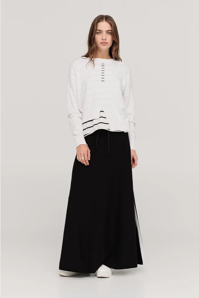 • Contrast ivory stripe running from waistband to hemline