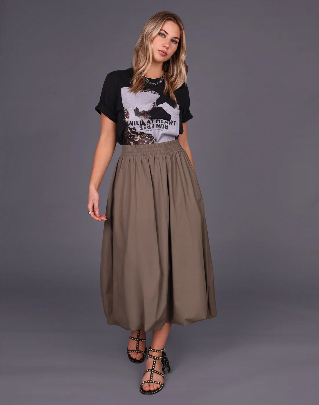 Featuring a wide cased elastic waistband, midi length silhouette, and puff bubble style hem, along with inseam side pockets, this skirt does it all and looks great doing it.