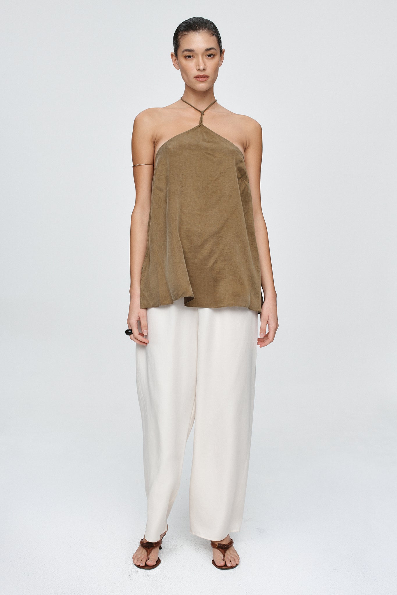 The Dante Top is cut from a soft blend of 80% Tencel and 20% Linen, combining fluid drape with natural texture. Designed with a halter neckline that ties at the back, it reveals an open back and softly flared hemline for ease and movement. The minimalist shape skims the body, offering an effortless balance between structure and fluidity.