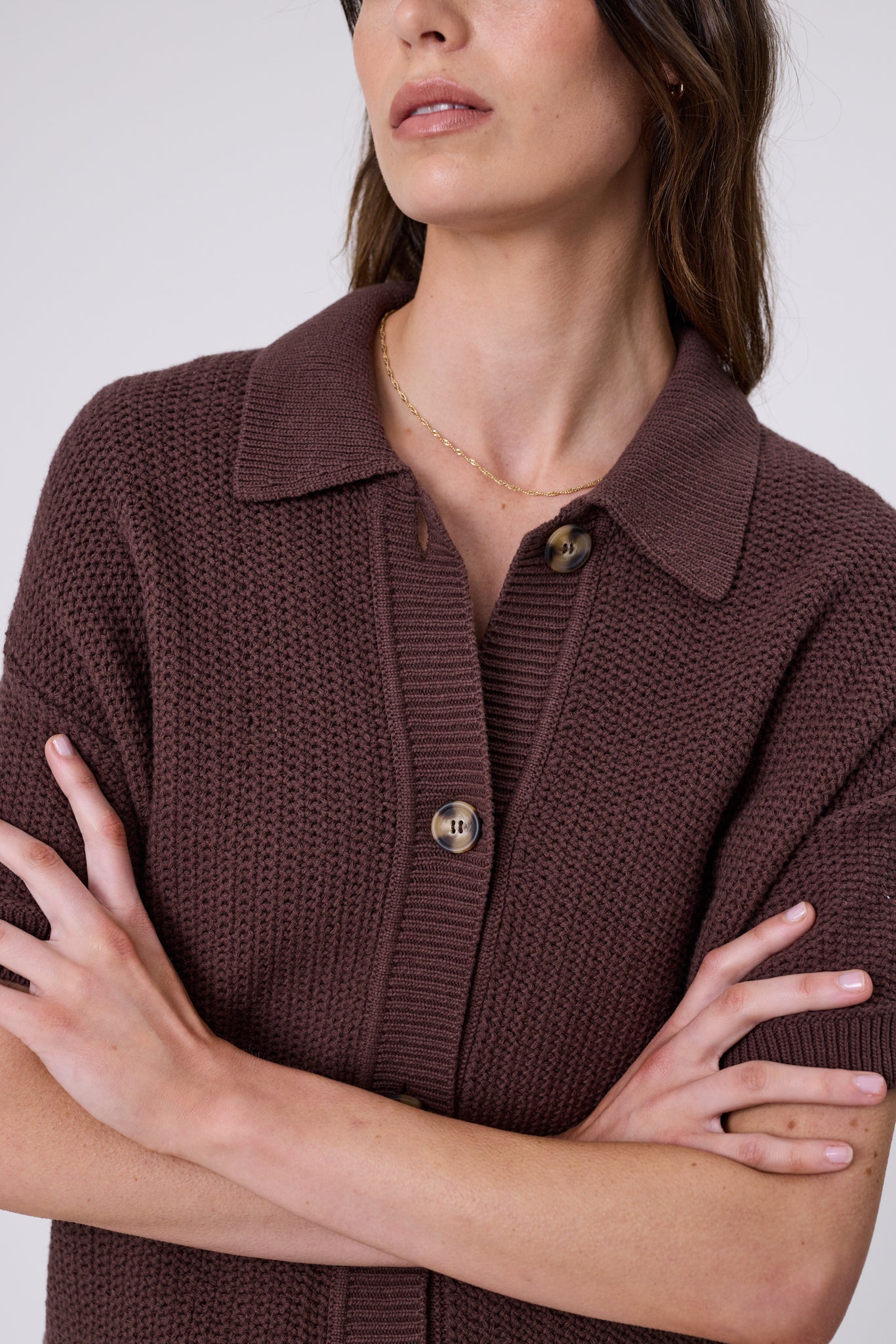 easy, everyday wear. Features a button-down front with tortoiseshell buttons and ribbed